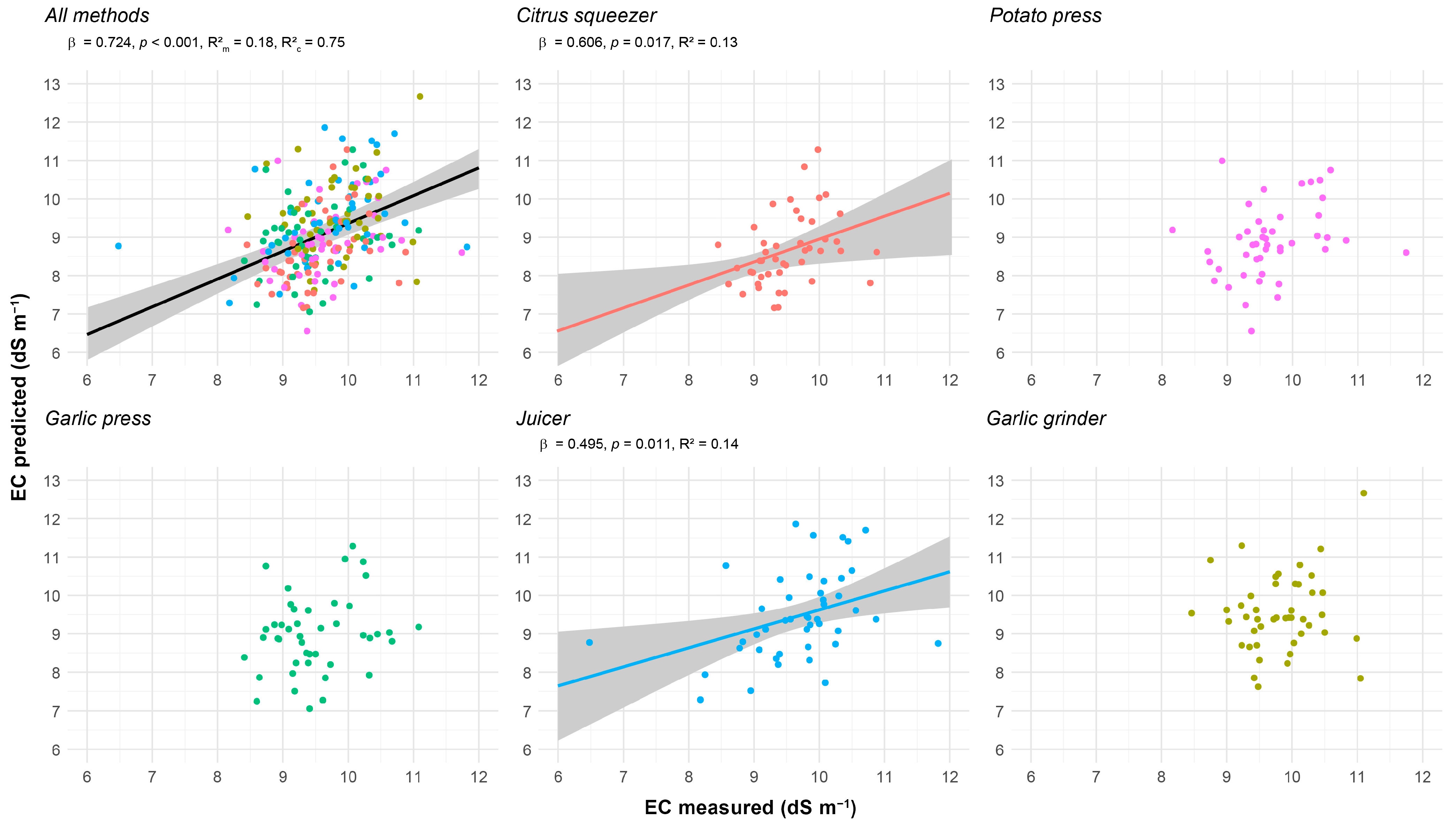 | EC (dS m−1) | Citrus squeezer | 9.48 ± 0.10 (a) | 0.56 | [9.31, 9.64] | [8.36, 10.88] | 5.85 (a) | 0.729 | 0.355 | 2.885 |