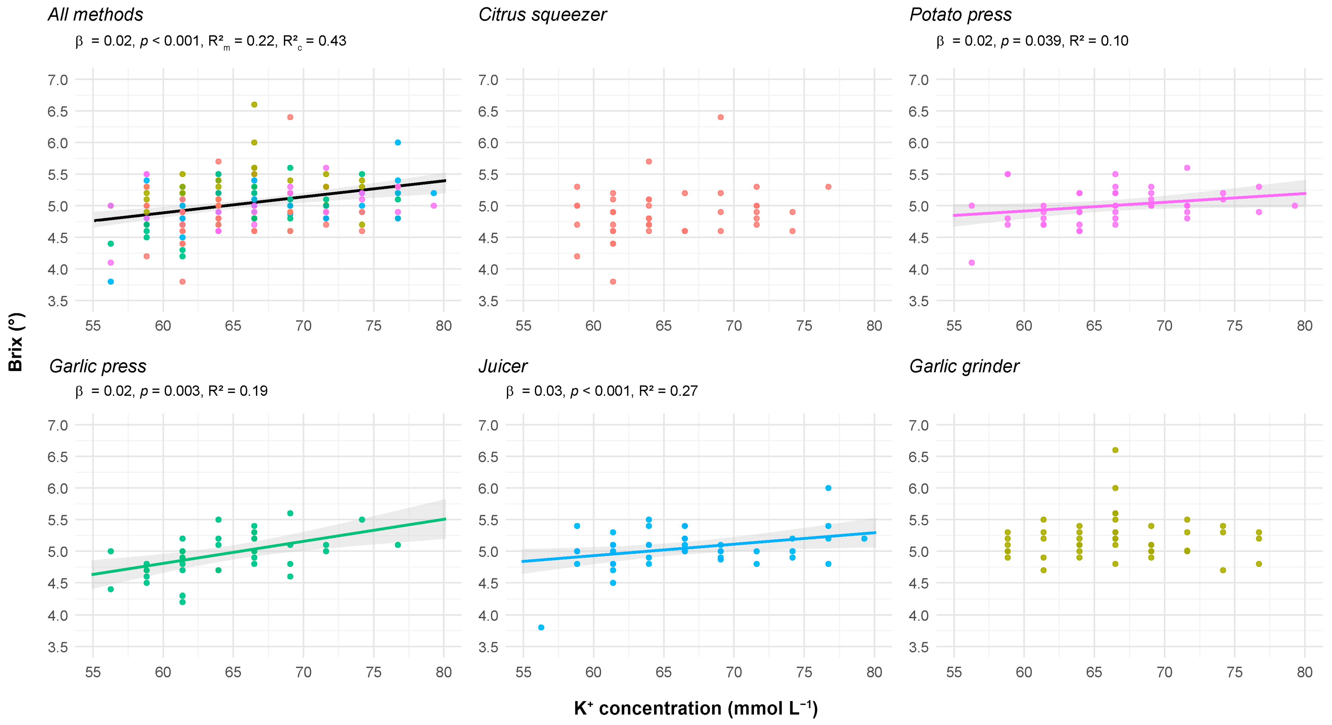 | K+ (mmol L−1) | Citrus squeezer | 64.62 ± 0.87 (a) | 5.33 | [63.02, 66.22] | [53.71, 76.72] | 8.13 (b) | 0.028 | 0.297 | 2.581 |