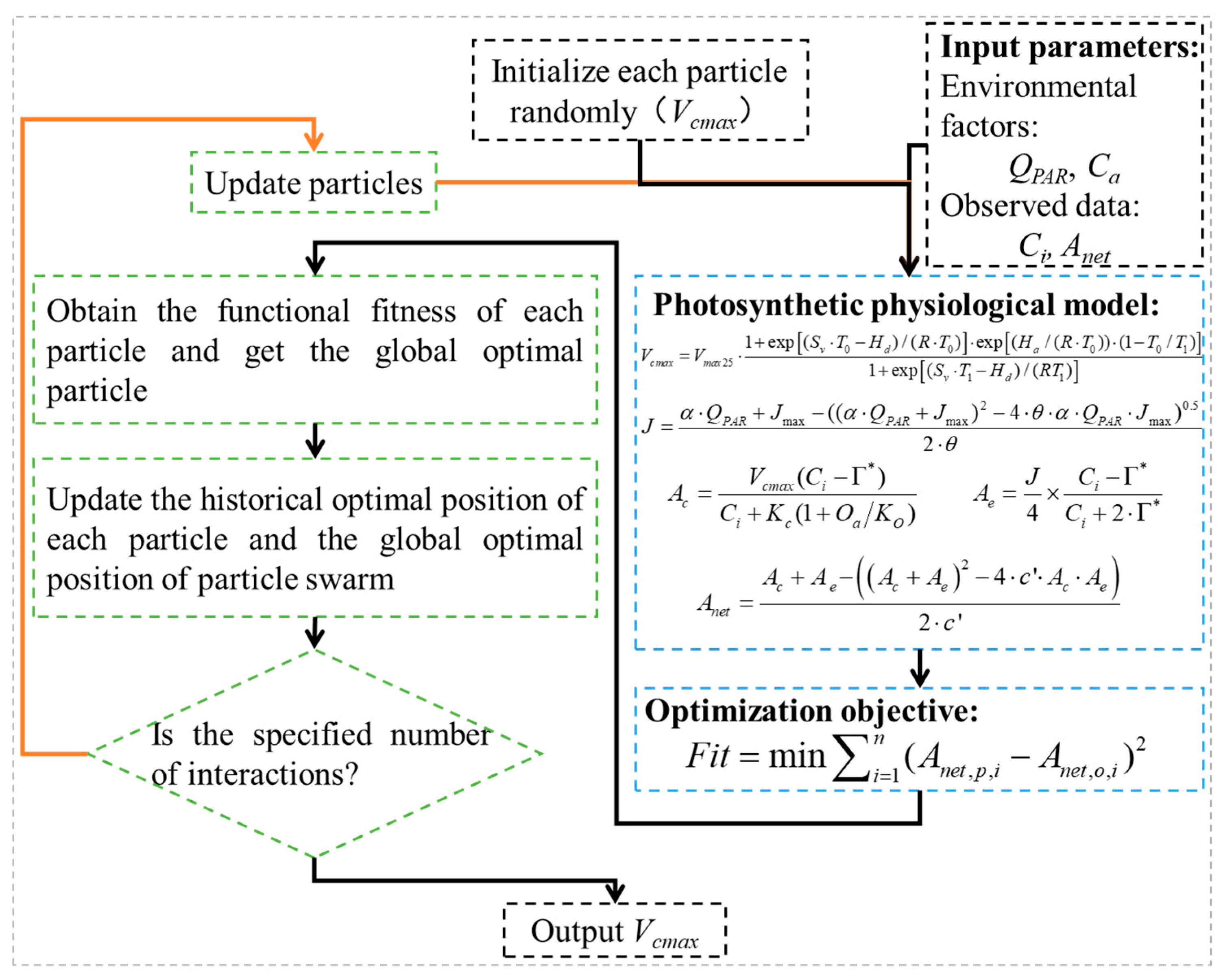 Figure 2. A schematic showing the calculation process for V c m a x . The particle swarm algorithm (PSO) was used to extract the maximum carboxylation rate ( V c m a x ) using the observed intercellular C O 2 concentration and photosynthetic rate ( A n e t ).