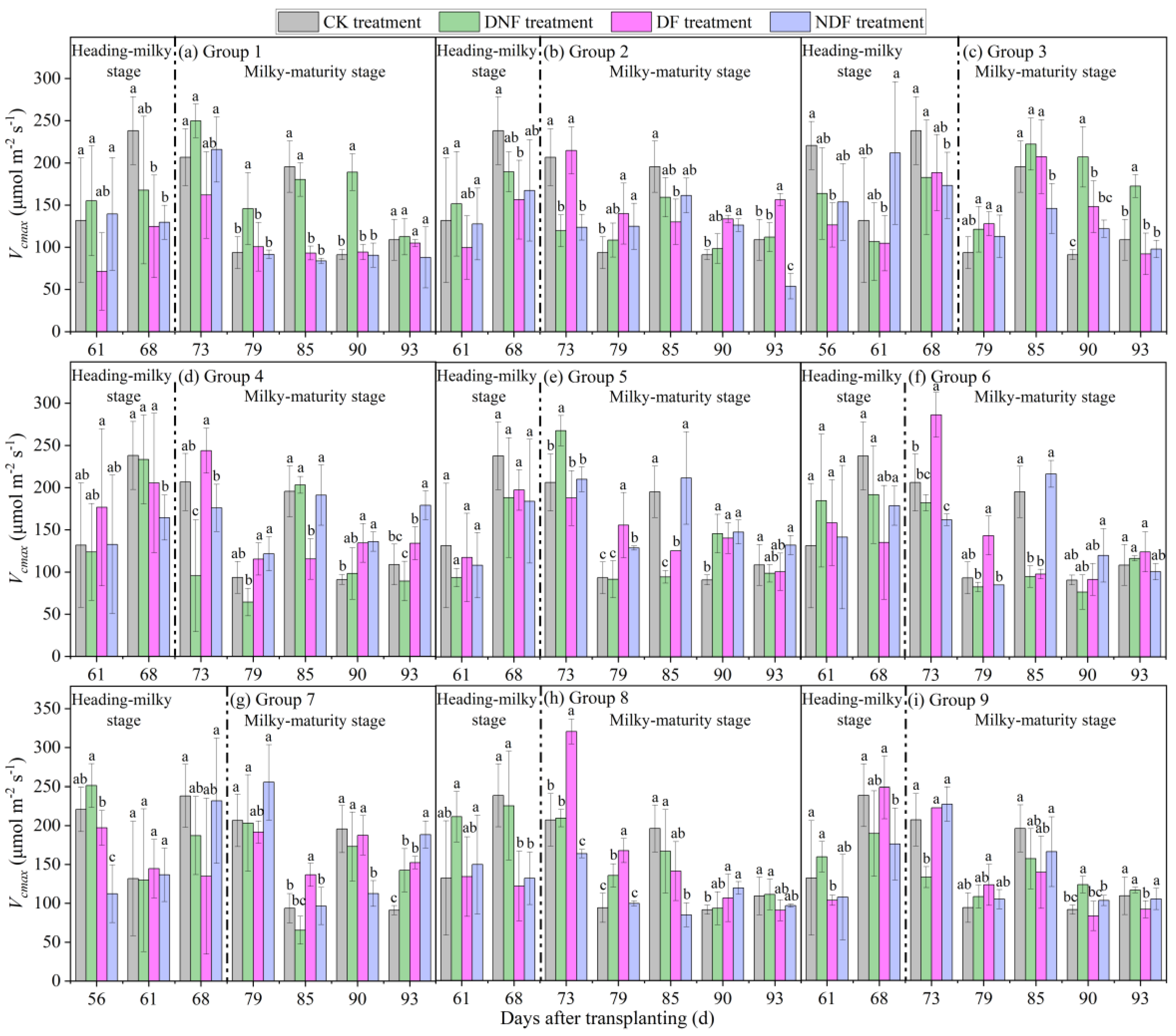 Figure 3. Dynamic changes in the maximum carboxylation activity ( V c m a x ) of rice under different stress treatments in 2017 and 2018. Figure (ai) correspond to Groups 1–9, respectively. Within each group, values are presented for the three treatments: DNF, DF, NDF, respectively. CK, control treatment; DF, drought–flood abrupt alternation; DNF, drought stress; and NDF, flooding stress. DF1, 50%FC + 5 d + 100% PH + 7 d; DF2, 50%FC + 10 d + 50% PH + 9 d; DF3, 50%FC + 15 d + 75%PH + 5 d; DF4, 60%FC + 5 d + 75% PH + 9 d; DF5, 60%FC + 10 d + 100%PH + 5 d; DF6, 60%FC + 15 d + 50% PH + 7 d; DF7, 70%FC + 5 d + 50% PH + 5 d; DF8, 70%FC + 10 d + 75% PH + 7 d; DF9, 70%FC + 15 d + 100%PH + 9 d. Each data point represents the mean of three replicates at each observation time, and the error bars represent the standard deviation (SD). Different lowercase letters (a, b, c) indicate significant differences among treatments (p < 0.05). Shared letters (e.g., ab or bc) indicate no significant difference between treatments (p > 0.05).