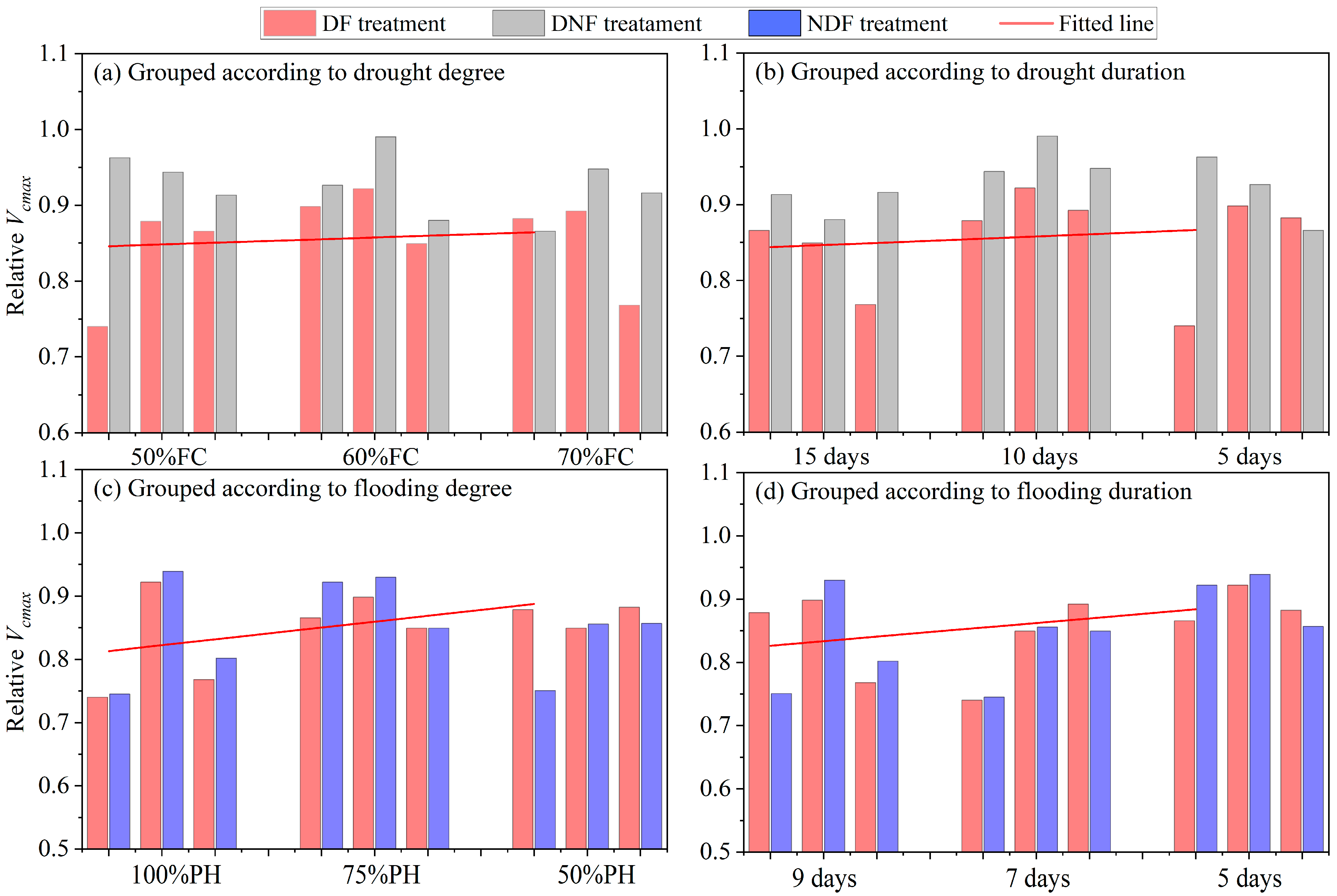 Figure 4. The relative maximum photosynthetic carboxylation rate ( V c m a x ) under DF treatments at different drought degrees, flooding degrees, drought durations, and flooding durations in 2017 and 2018. Each data in the figure represents the average value of all measurements for two years of each treatment. FC and PH represent field capacity and plant height, respectively. The red line denotes the fitted regression trend between V c m a x under DF treatment and the corresponding stress factors.