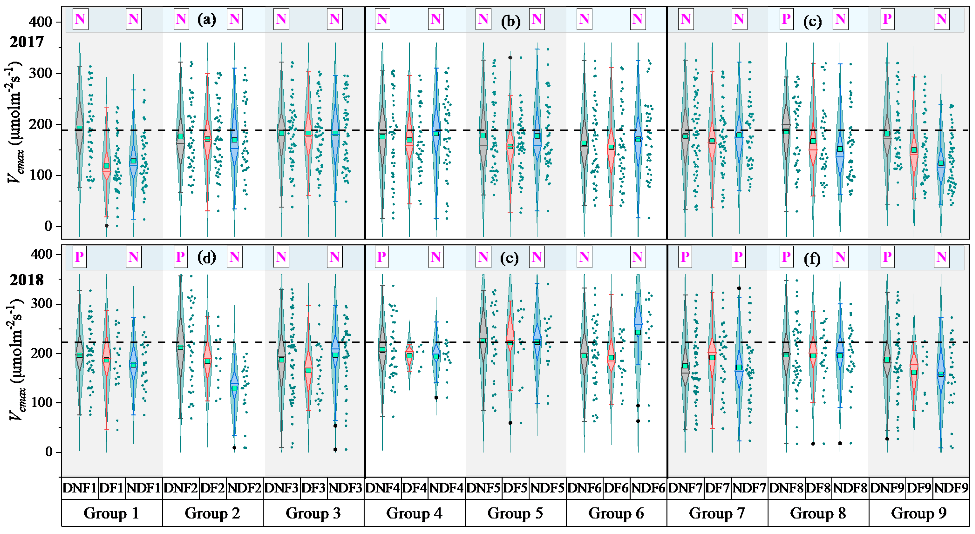 Figure 5. Effects of drought–flood abrupt alternation (DF) events on rice maximum carboxylation activity ( V c m a x ) compared to single drought (DNF) or flooding (NDF) treatments in 2017 and 2018. Figure (a,d) show the treatment effects on V c m a x for Groups 1–3; Figure (b,e) correspond to Groups 4–6; and Figure (c,f) correspond to Groups 7–9. N and P indicate the effects of drought (flooding) on flooding (drought) in DF events. Specifically, N and P represent negative and positive effects, respectively. Groups 1–3: DF treatments with severe drought in the early stage, Groups 4–6: moderate drought in the early stage, and Groups 7–9: mild drought in the early stage. Similarly, Group 1, Group 5, and Group 9 are DF treatments with severe flooding in the later stages; Group 3, Group 4, and Group 8 are DF treatments with moderate flooding in the later stages; and Group 2, Group 6, and Group 7 are DF treatments with mild flooding in the later stages.