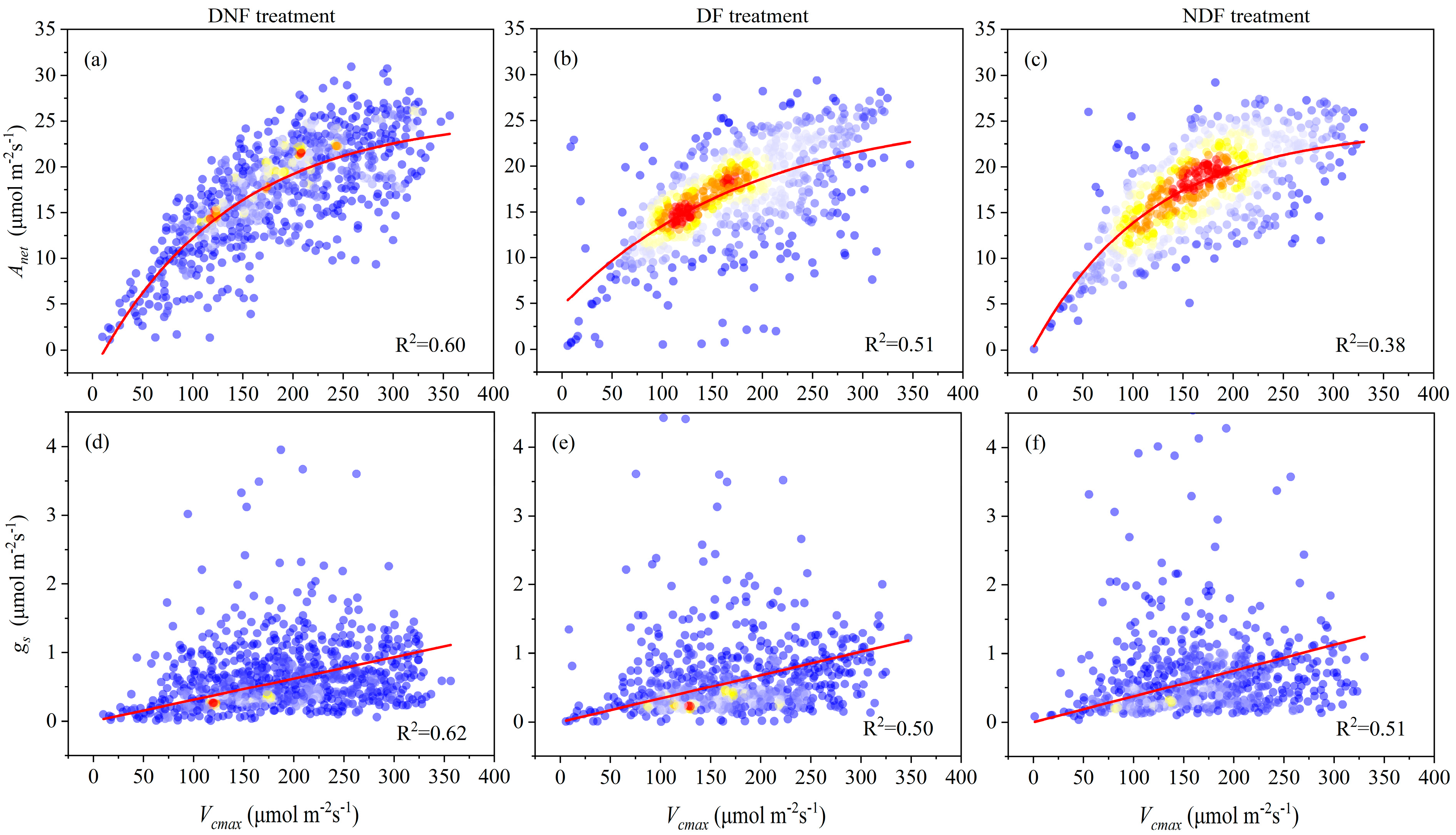 Figure 6. Observed relationship between gas exchange parameters ( A n e t and g s ) and the maximum carboxylation activity ( V c m a x ) in different treatments according to the datasets measured in 2017 and 2018. Figure (ac) show the correlation between A n e t and V c m a x under the DNF, DF, and NDF treatments, respectively. Figure (df) show the corresponding correlation between g s and V c m a x . In this figure, DNF represents all the groups that experienced drought stress, including DNF 1–9; NDF represents all groups that experienced flooding stress, including NDF 1–9; and DF represents all groups experienced drought–flood abrupt alternation, including DF 1–9.