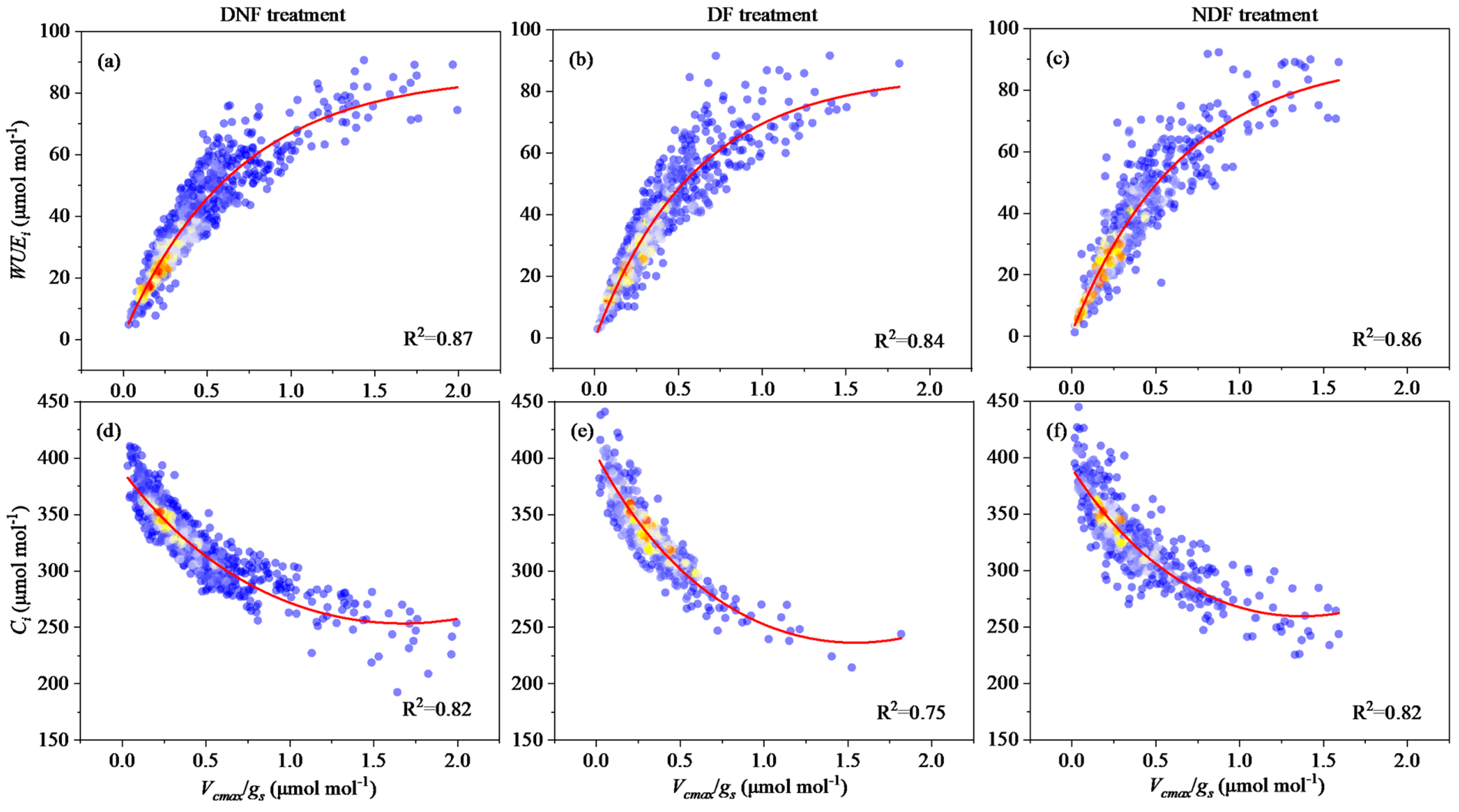 Figure 7. Observed relationship between the intercellular C O 2 concentration ( C i ) and intrinsic water use efficiency ( W U E i ) and the ratio of the maximum carboxylation Rubisco activity ( V c m a x ) to stomatal conductance ( g s ). Figure (ac) show the correlation between W U E i and V c m a x / g s under the DNF, DF, and NDF treatments, respectively. Figure (df) show the corresponding correlation between C and V c m a x / g s . In this figure, DNF represents all the groups that experienced drought stress, including DNF 1–9; NDF represents all groups that experienced flooding stress, including NDF 1–9; and DF represents all groups that experienced drought–flood abrupt alternation, including DF 1–9.