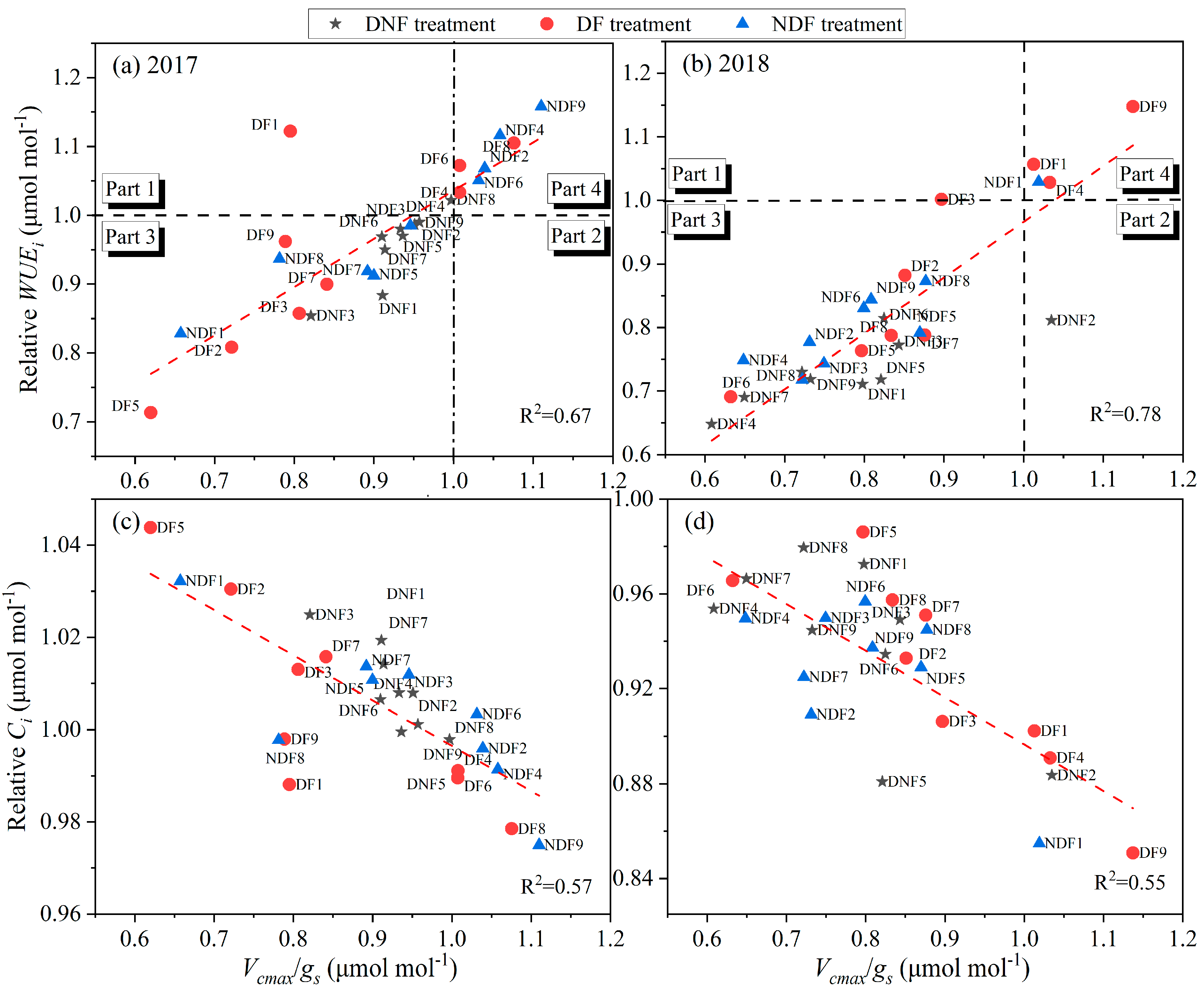 Figure 8. Relationship between intrinsic water use efficiency ( W U E i ) and the ratio of photosynthetic carboxylation capacity ( V c m a x ) to stomatal conductance ( g s ) in rice experiencing different drought and flooding stresses. Each data in the figure represents the average value of all measurements for each treatment. Figure (a,c) is the observed data from 2017. Similarly, Figure (b,d) is the observed data from 2018.