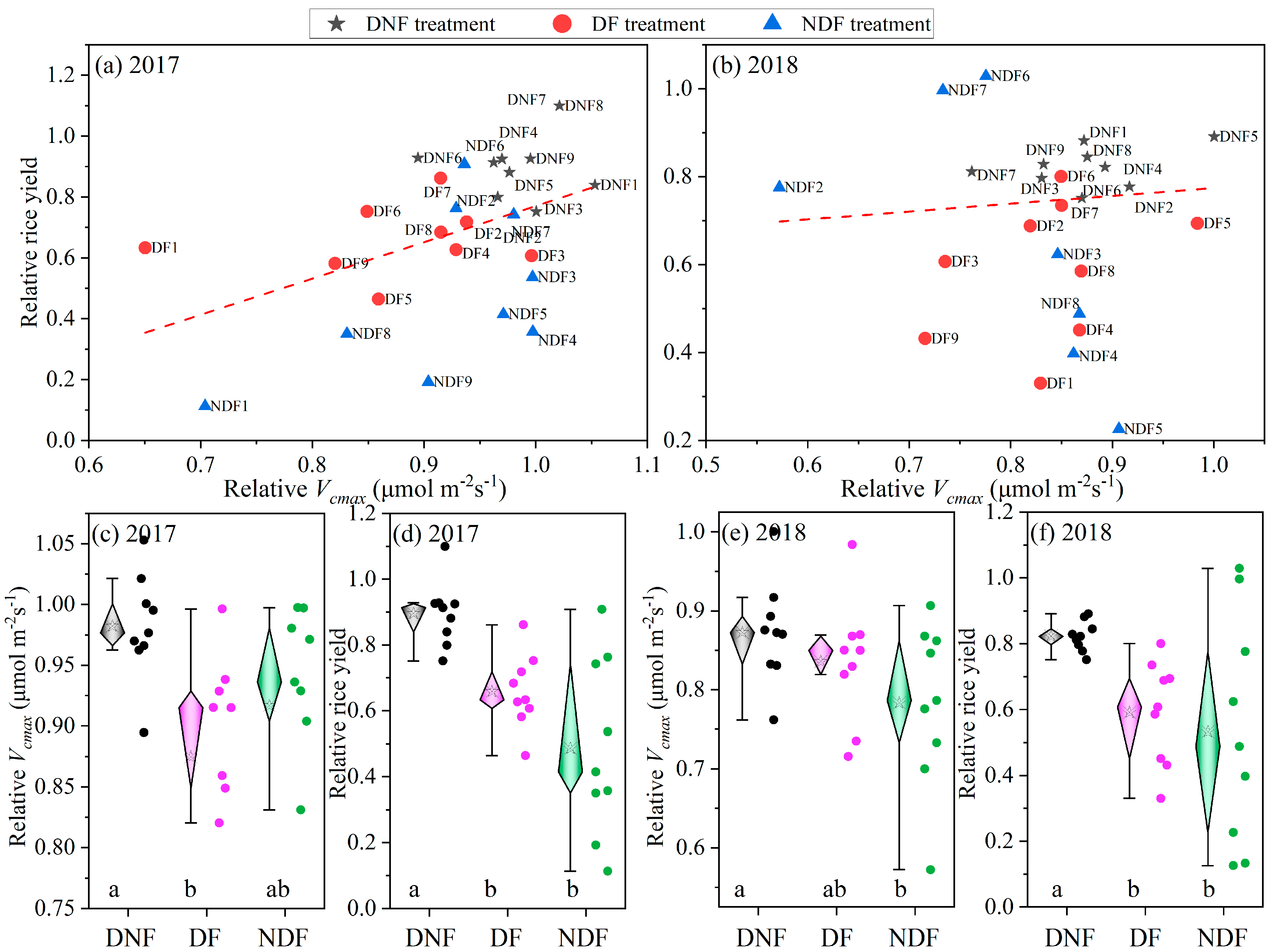 Figure 10. Relationship between rice yield and the photosynthetic carboxylation capacity ( V c m a x ) in rice experiencing different drought and flooding stresses. Each data in Figure (a,b) represents the average value of all measurements for each treatment. Each data point in Figure (cf) represents the mean value calculated from all corresponding treatments. Different lowercase letters (e.g., a, b) indicate significant differences among treatments (p < 0.05). Shared letters (e.g., ab) indicate no significant difference between treatments (p > 0.05).