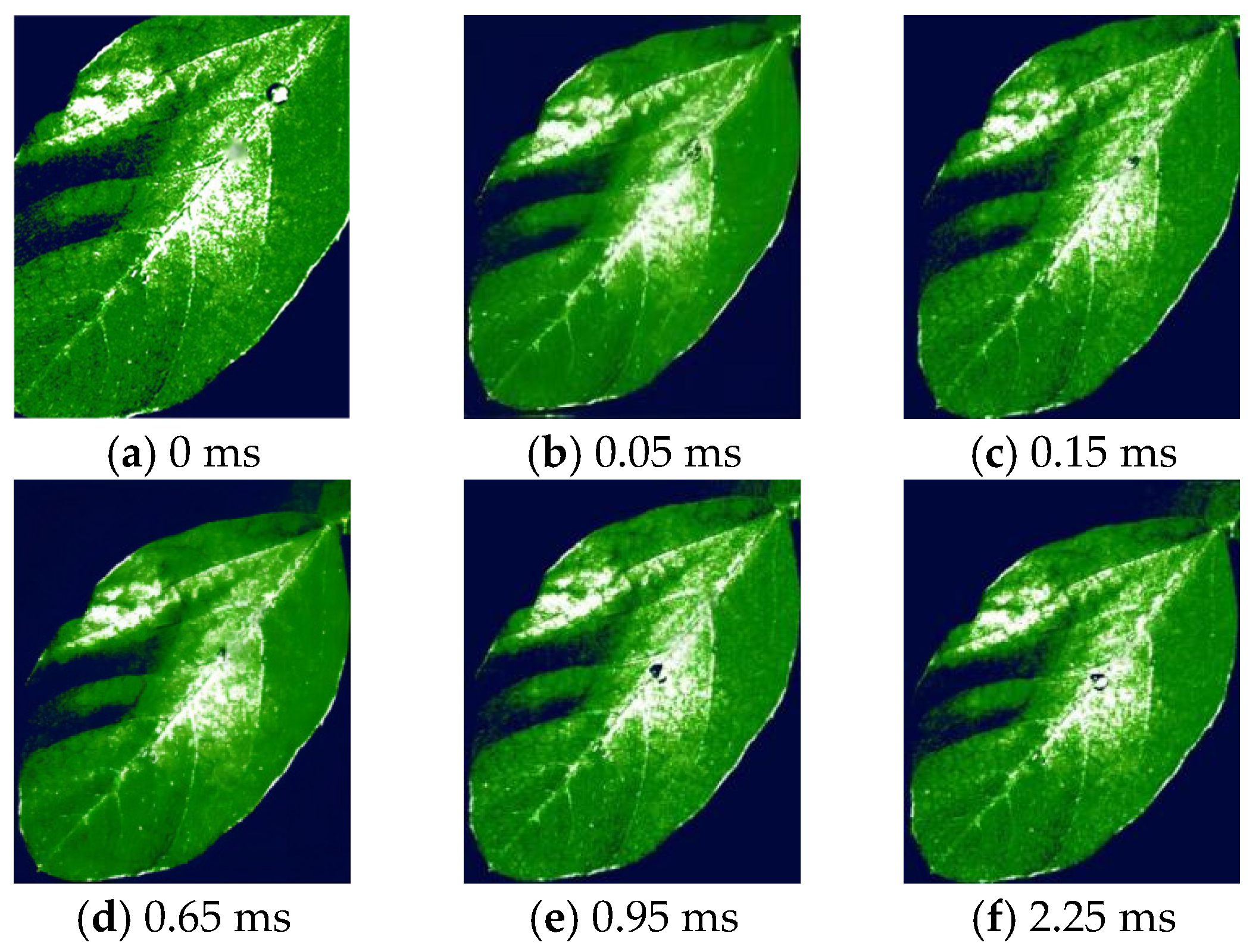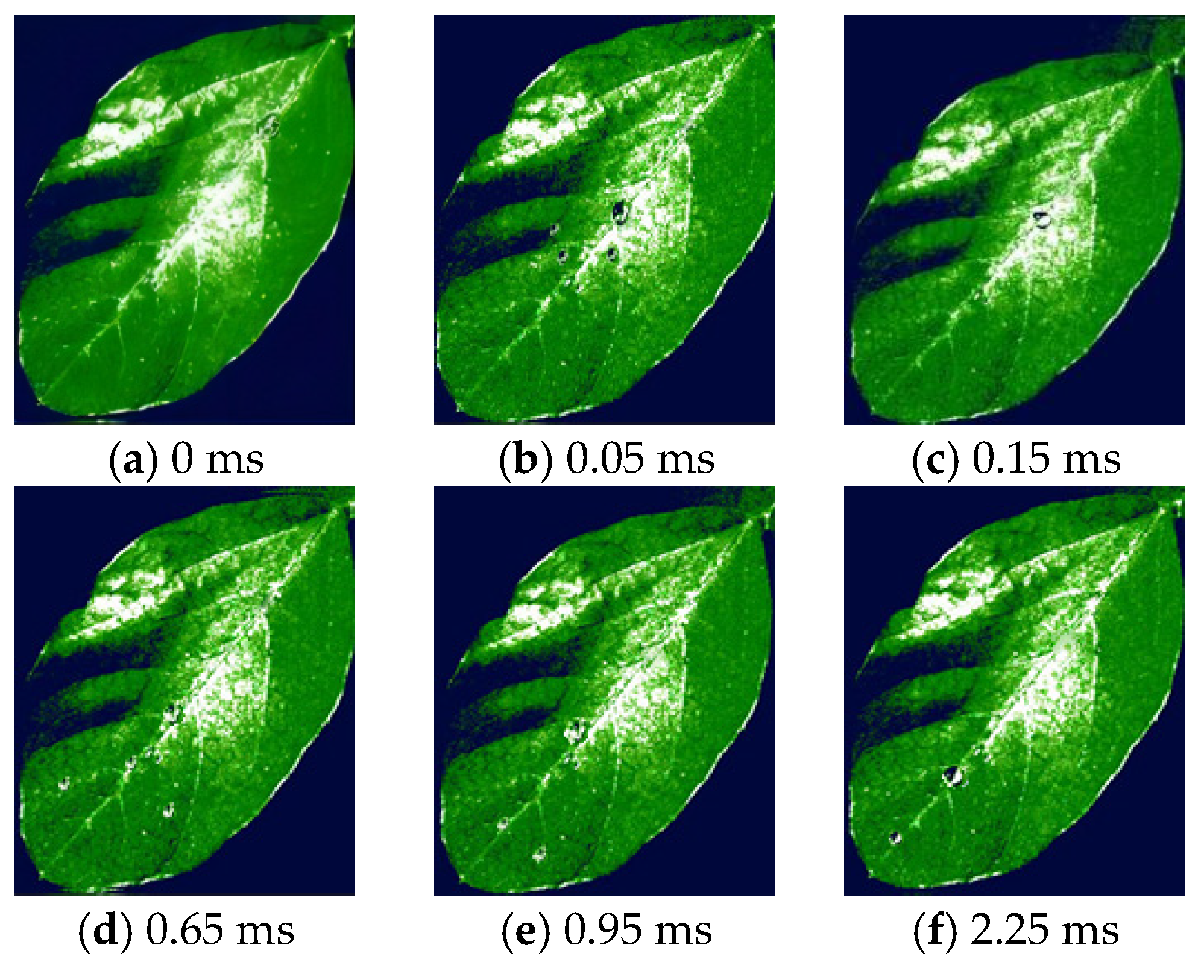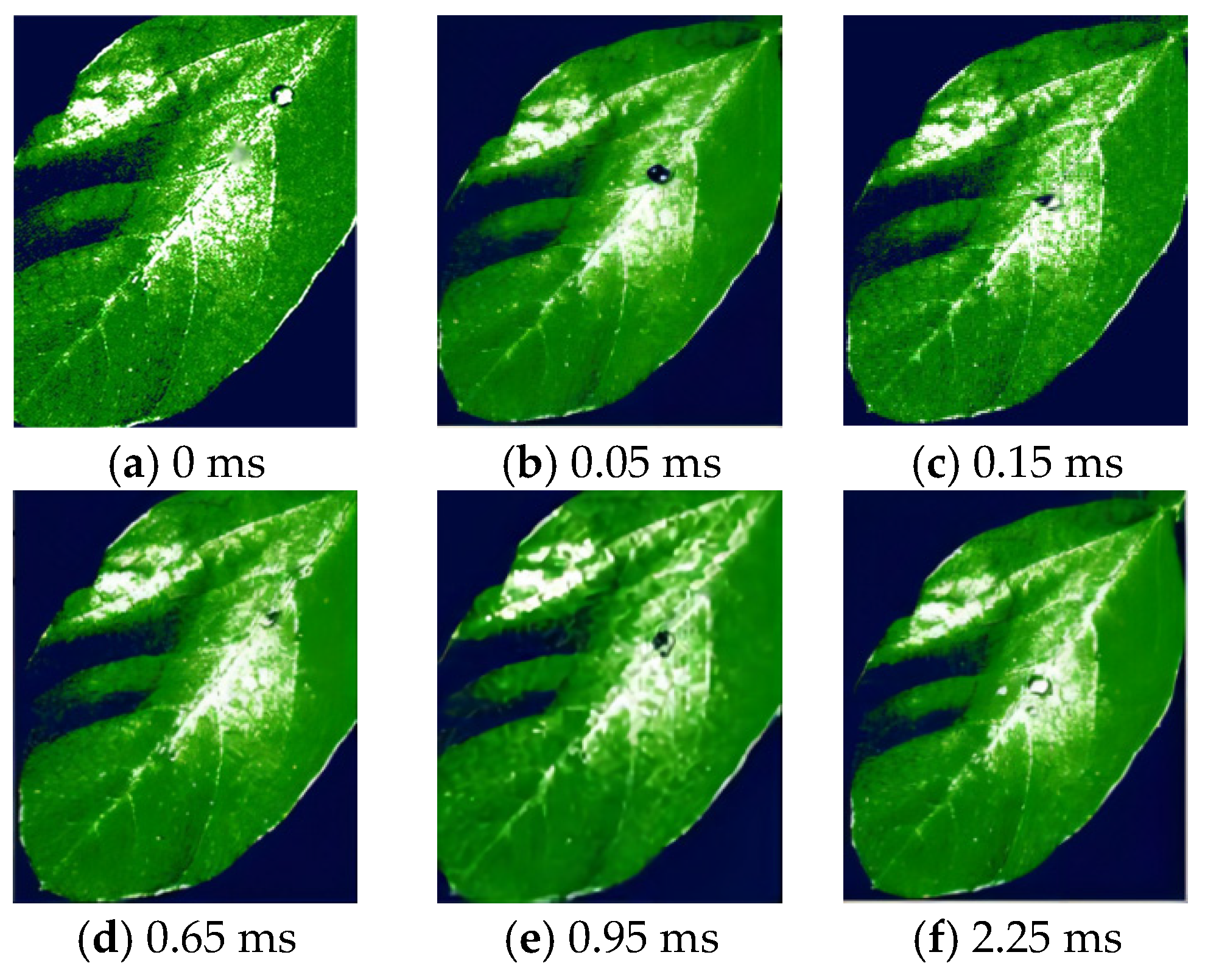 3.2. Droplet Deposition Characteristics Determined by High-Speed Camera Technology Analysis