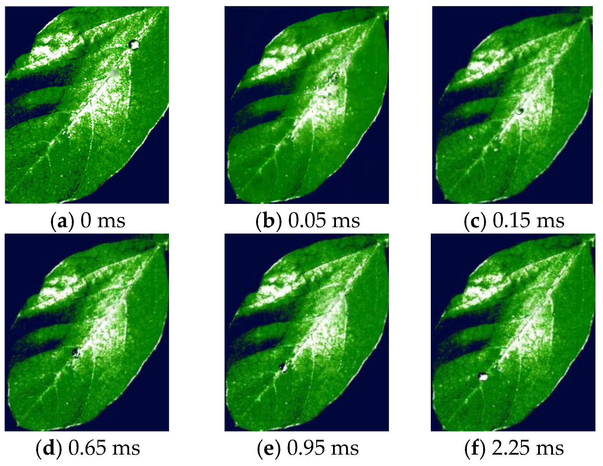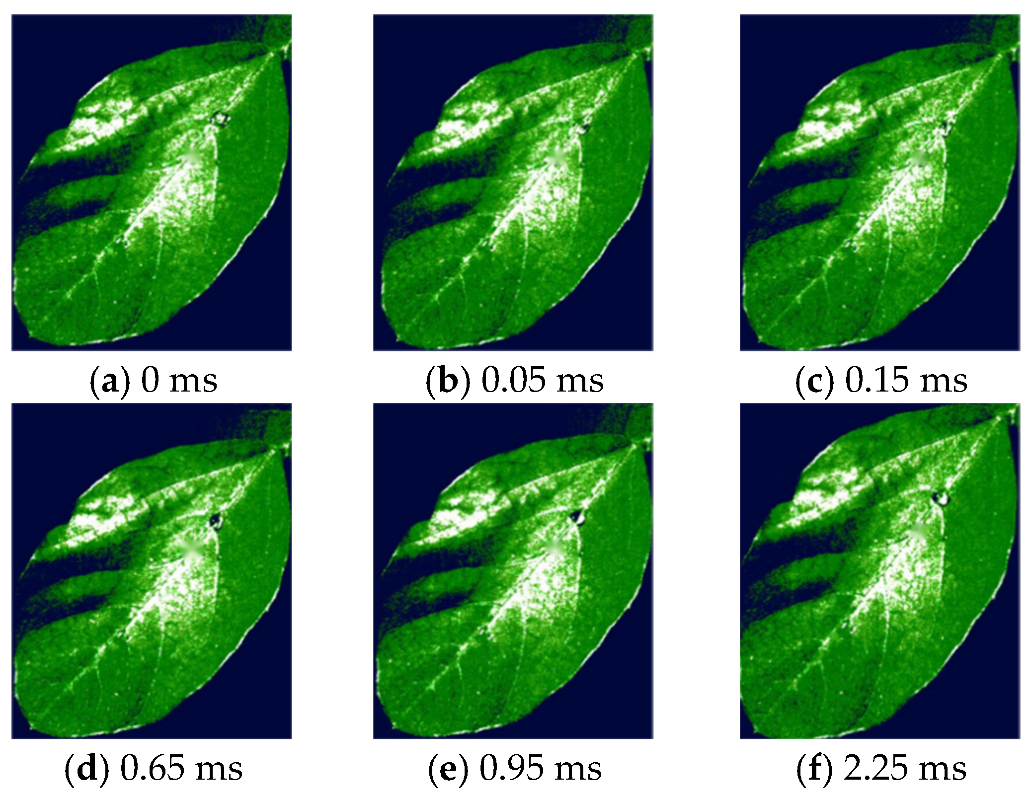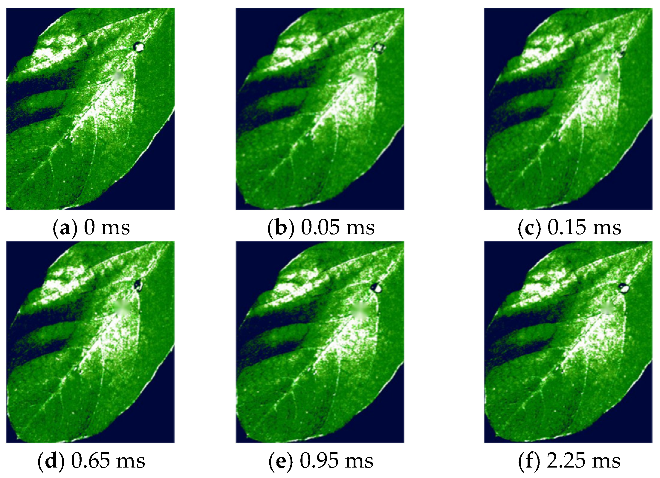 3.2. Droplet Deposition Characteristics Determined by High-Speed Camera Technology Analysis