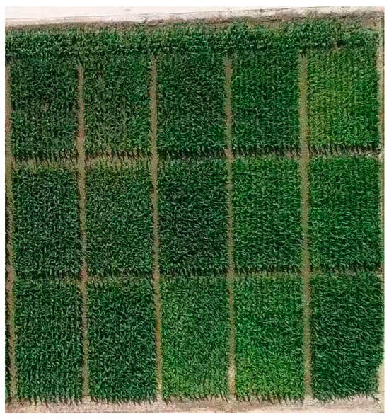 The indicator crop was a dual-purpose grain and forage maize variety (Xianyu No. 1225, Figure 1). The organic fertilizers used in the experiment were derived from large quantities of beef cattle manure produced by the surrounding livestock and poultry breeding, rapidly decomposed and fermented using the “molecular membrane” (Nano-black film, which is waterproof, moisture-permeable, deodorizing, and nitrogen-retaining) aerobic composting technology. The total nutrient content of the fertilizer was 4.35% (total nitrogen 2.00%, total phosphorus 1.28%, total potassium 1.07%), with an OM content of 45%, mechanical impurities < 0.5%, moisture content 20.7%, pH 7.99, and total salt content of 11.78 g/kg, meeting the reference standards of NY/T 525-2021 []. The germination index of maize seeds for the fermented organic fertilizer was 70%, and the mortality rate of ascarid eggs was 98%, meeting the reference standards of NY/T 3442-2019 []. The chemical fertilizers used were all purchased from the market: urea (N 46%), calcium superphosphate (P2O5 12%), and potassium sulfate (K2O 50%).