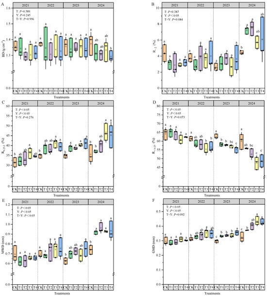 Effects of substituting organic fertilizers for chemical nitrogen fertilizers on soil’s physical properties. Different lowercase letters denote significant differences between substituting organic fertilizers for chemical nitrogen fertilizers in the same year at p < 0.05. (A) BD, bulk density; (B) R>2, water-stable aggregates of >2 mm; (C) R0.25–2, water-stable aggregates of 0.25–2 mm; (D) R<0.25, water-stable aggregates of <0.25 mm; (E) MWD, mean weight diameter; and (F) GMD, geometric mean diameter.