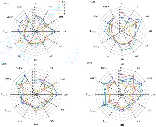 The radar charts of the soil indicator scores varied during 2021–2024. In 2021, under the T4 treatment, the scores of the TS, pH, AN, and R<0.25 indicators were reduced, but the OM, AP, and R0.25–2 scores increased; under the T1 treatment, the pH, R<0.25, and MWD scores increased. In 2022, under the T1 treatment, the OM, AN, R<0.25, R0.25–2, MWD, and GMD scores increased, while under the T2 treatment, the AP, AK, and BD scores increased. In 2023, under the T1 treatment, the AN, AP, and GMD scores increased, and under the T4 treatment, the OM score increased. In 2024, under the T1 treatment, the AN, R>2, R0.25–2, and GMD scores increased. Overall, the T1 treatment increased the AN scores the most, while the T4 treatment increased the OM scores the most (Figure 4).