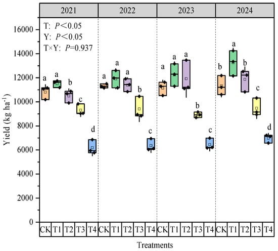 The maize yield significantly differed among treatments and across years (p < 0.05). In 2021, the yield from the T1 treatment was the highest, with no significant differences compared to CK (p > 0.05); in contrast, the yield from the T2, T3, and T4 treatments was reduced by 2.92–42.72% compared to CK. In 2022, there were no significant differences among the T1, T2, and CK treatments (p > 0.05), while the yield from the T3 and T4 treatments was 16.81% and 43.68% lower (p < 0.05), respectively, than for CK. In 2023, the yield from the T1 and T2 treatments was 9.90% and 6.98% higher, respectively, than for CK, while the yield from the T3 and T4 treatments was 9.94% and 42.10% lower, respectively, compared to CK. In 2024, the yield from the T1 treatment was significantly higher by 16.93% compared to CK (p < 0.05), but with no significant differences between the T2 and CK treatments (p > 0.05). The yield from the T3 and T4 treatments was 16.43% and 38.46% lower, respectively, than for CK. Notably, the interannual yield changes suggested that the CK yield remained relatively stable. In 2024, the yield from the T1 treatment increased by 15.06% compared to 2021, while the other treatments showed yield increases of 1.79–13.05% (Figure 6). This reveals that the annual application of organic fertilizers improved the maize yield.
