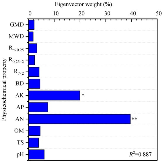 Principal component analysis was performed on the 12 soil indicators tested in this study to extract the common factor variance of each indicator. The weight value of each indicator was obtained by calculating the ratio of the common factor variance of the indicator to the sum of the common factor variances. The SQI was calculated using the following formula, with a higher SQI value meaning higher soil quality []: