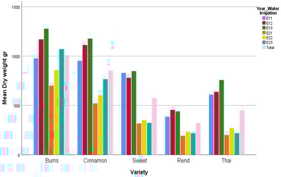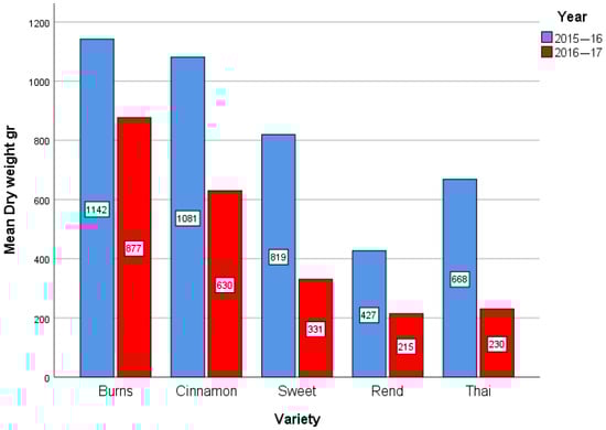 The comparison of mean dry weight across the two growing seasons revealed a consistent decline in biomass production for all basil varieties (Figure 1). During 2015–2016, yields were substantially higher compared to 2016–2017, indicating the dominant influence of seasonal environmental conditions on overall productivity. Burns recorded the highest mean biomass in both years (1142 g in 2015–2016 and 877 g in 2016–2017), confirming its superior and stable performance across environments. Cinnamon followed closely (1081 g and 630 g, respectively), also demonstrating relatively consistent productivity. In contrast, Sweet, Rend, and Thai showed considerably lower yields and sharper interannual declines—particularly Rend (427 → 215 g) and Thai (668 → 230 g)—suggesting greater environmental sensitivity. The nonparallel responses of varieties across years indicate a significant genotype × environment interaction, where Burns and Cinnamon maintained adaptability and yield stability, whereas Sweet, Rend, and Thai were more dependent on favorable conditions.