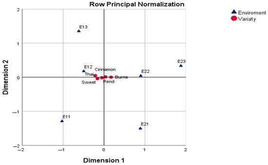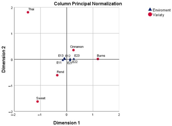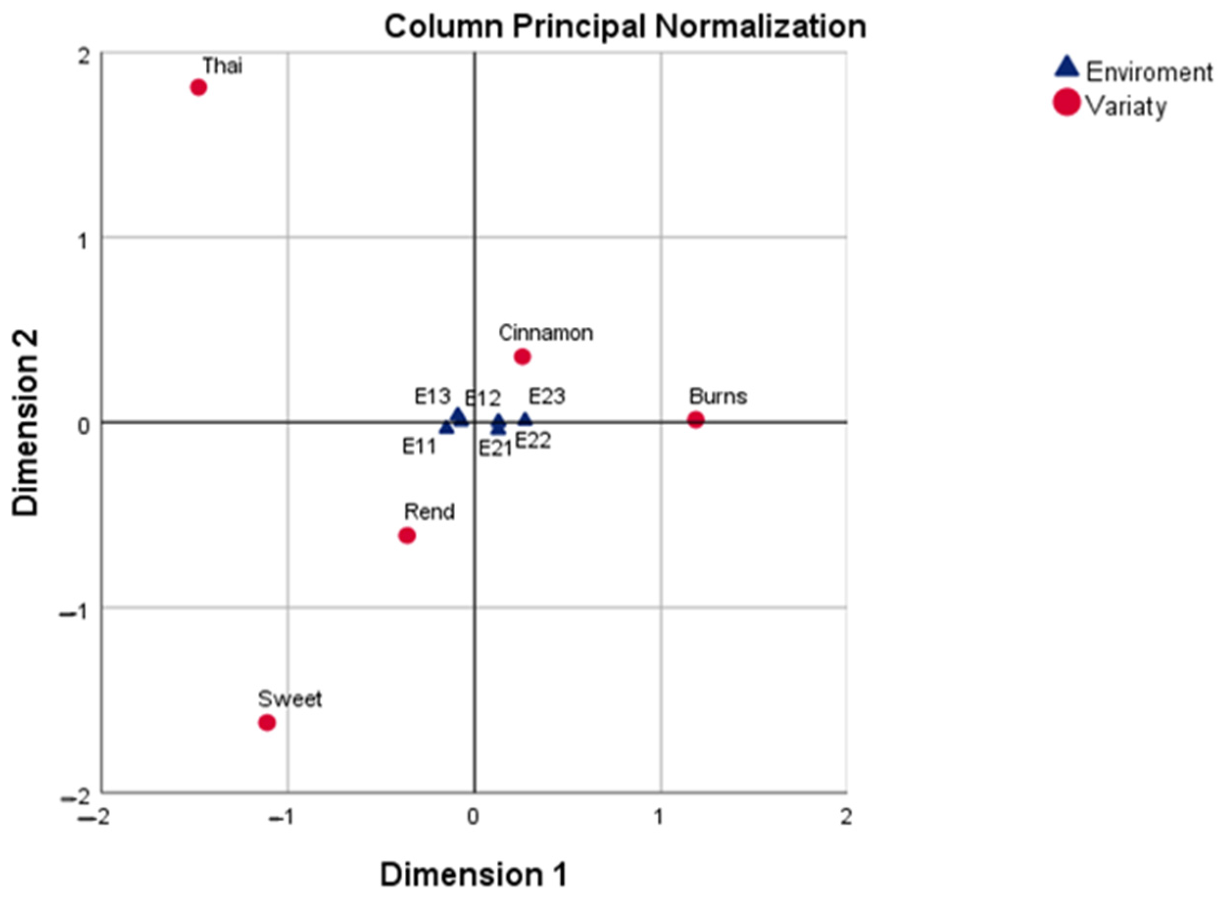 The row principal normalization (CA-RPN) emphasized varietal profiles, but the clustering of genotypes around the centroid indicated that the varieties themselves were less sharply differentiated than the environments. Here, Burns and Cinnamon again tended toward the favorable side of the first axis, while Sweet and Thai occupied the opposite pole, consistent with the SN solution but in a more compressed representation. This configuration is useful when the research objective is to compare genotypes directly, but it provides less information about environmental structuring.