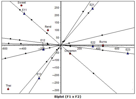 From the environmental side (Table 3, Figure 9), E11 is closely associated with Sweet and Thai, whereas E22 strongly discriminates in favor of Burns and E21 is most related to Cinnamon. E13 shows moderate links with several varieties, while E23 further reinforces the separation of Burns. Overall, the second-year environments appear to differentiate varieties more clearly than those of the first year.