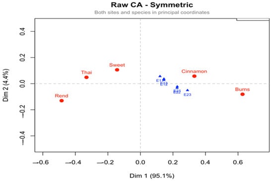 The analysis of row inertias (Table 5) shows that varieties differ substantially in their contribution to the factorial structure. Burns (Inertia = 0.0032; Ctr = 44%; Cor = 0.32; Qlt = 0.84) emerged as the strongest contributor, defining the positive side of Dimension 1. Rend (Inertia = 0.0020; Ctr = 27%; Cor = 0.29; Qlt = 0.77) also played a key role, driving the negative side of the same axis. In contrast, Cinnamon (Inertia = 0.0009; Ctr = 12%; Cor = 0.21; Qlt = 0.65) and Thai (Inertia = 0.0009; Ctr = 12%; Cor = 0.18; Qlt = 0.61) had moderate contributions, reflecting intermediate positions closer to the centroid. Sweet (Inertia = 0.0003; Ctr = 4%; Cor = 0.12; Qlt = 0.41) showed the lowest influence, indicating that it does not strongly differentiate along the main axes and remains relatively neutral. Overall, Burns and Rend drive the main factorial contrast, while Sweet represents a central, non-discriminating profile.