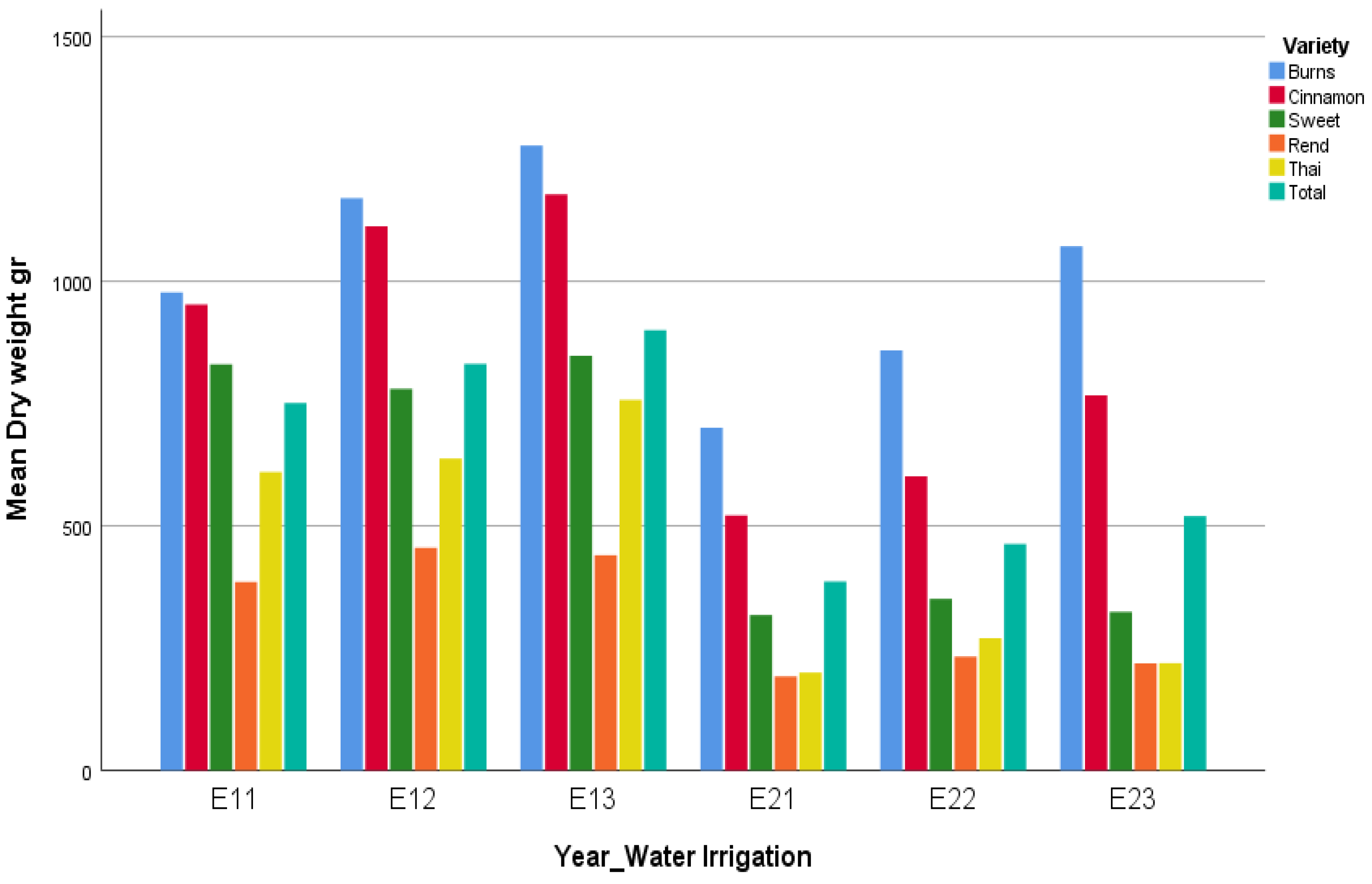 From a biological perspective, the results consistently show that Burns Lemon is the most stable and high-performing genotype, capable of exploiting favorable environments such as Year 2 under full irrigation. Cinnamon displayed broader adaptability, performing moderately well across environments without the strong specificity of Burns. Sweet and Thai, on the other hand, were more environment-dependent, performing relatively better under the harsher first-year conditions but lacking consistency under more favorable ones. Rend emerged as a low-yielding and non-discriminating genotype, with no clear adaptation pattern. These findings highlight the diversity of adaptive strategies within basil and suggest that breeding for high yield and stability could prioritize Burns and Cinnamon, whereas Sweet and Thai may be better suited for stress-prone environments or niche cultivation.
