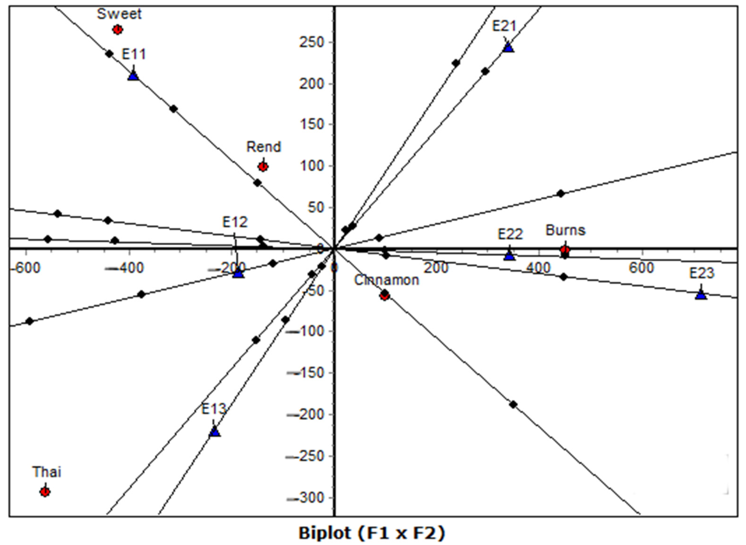 In this context, the biplot-axis analysis reinforced the geometric conclusions from both CA and CA-raw, confirming that Burns and Cinnamon are the most stable and discriminating genotypes, while Sweet and Thai exhibit higher environmental dependency. The convergence of graphical and quantitative evidence underscores the reliability of the correspondence analysis framework for dissecting G × E interactions.