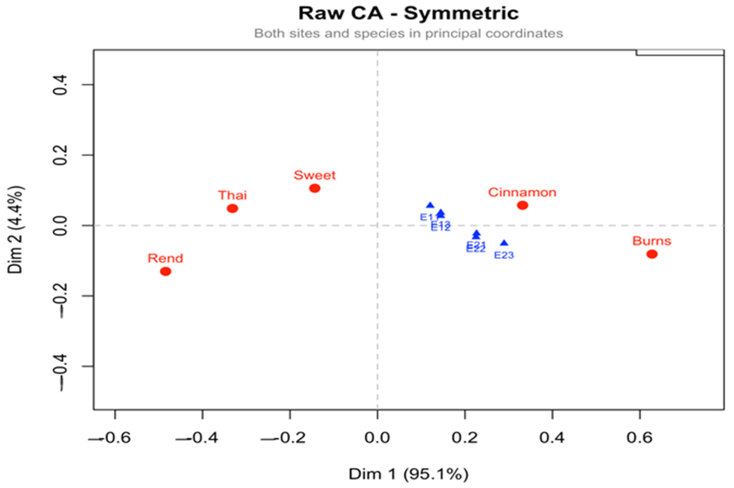 By contrast, the column principal normalization (CA-CPN) placed environments at the center of the analysis, showing that E21–E23 formed a coherent cluster of favorable conditions, while E11–E13 represented contrasting, less productive environments. The varieties were projected accordingly, with Burns and Cinnamon strongly aligned with the positive pole (E21–E23) and Sweet and Thai with the negative pole (E11–E13). Rend remained near the centroid, reflecting its lack of strong specificity. This solution is particularly useful for identifying discriminating environments that can be employed in future breeding trials to reveal varietal differences efficiently.