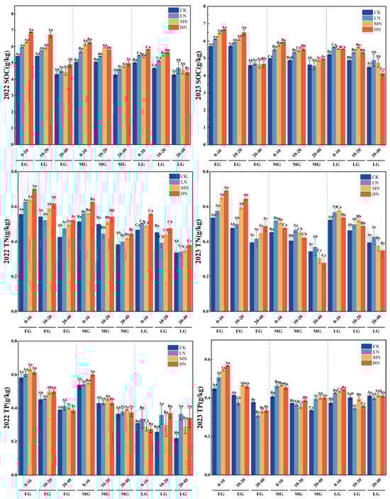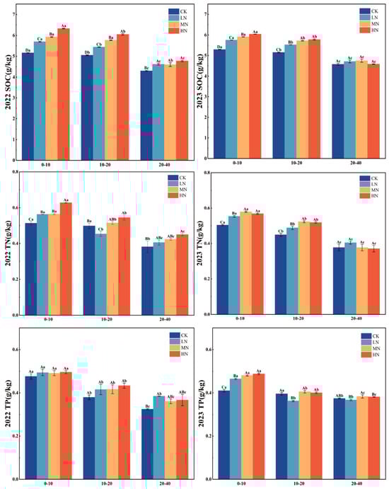 Variations in SOC, TN, and TP across different soil layers under various nitrogen treatments. Note: capital letters indicate significant differences in the indicators among different fertilization treatments of wheat at the same soil depth, while lowercase letters denote significant differences across various soil depths under the same fertilization treatment. SOC: soil organic carbon; TN: total nitrogen; and TP: total phosphorus.