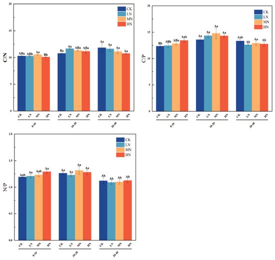 At the 0−10 cm depth, the C:N ratio under the moderate nitrogen (MN) treatment was significantly higher than under the control (CK) (p < 0.05, Figure 4). In contrast, no significant differences in the C:N ratio were observed among the four treatments at the 10−40 cm depth. The soil C:N ratio increased significantly with depth under both low (LN) and high (HN) nitrogen treatments (p < 0.05), whereas no significant variation was observed in the control (CK) and medium nitrogen (MN) treatments (p > 0.05). For the soil C:P ratio, no significant differences were observed among soil layers across all treatments, with the exception of under low nitrogen (LN) application (p > 0.05). Similarly, the N:P ratio was significantly affected by depth only under HN application (p < 0.05), showing no stratification under other conditions.