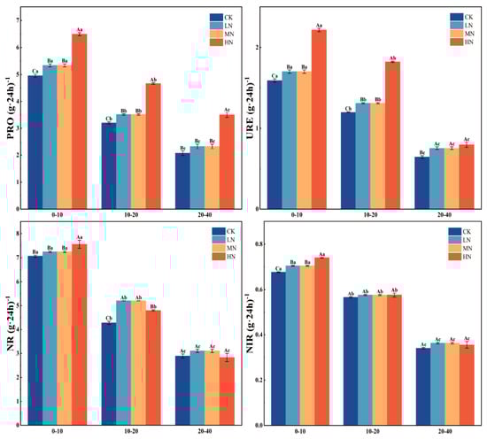 Variations in soil enzyme activities across different soil layers under various nitrogen treatments. Note: capital letters indicate significant differences in the indicators among different fertil ization treatments of wheat at the same soil depth, while lowercase letters denote significant di −ferences across various soil depths under the same fertilization treatment. PRO: soil protease; URE: urease; NR: nitrate reductase; and NIR: nitrite reductase.
