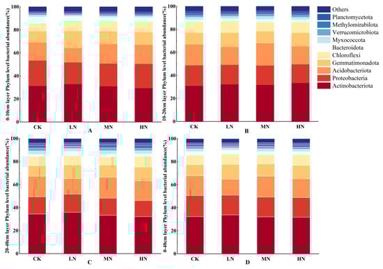 Variations in relative abundance of bacterial phyla across different soil layers under various nitrogen treatments. Note: in the figure, panels (A–D) represent the relative abundances of bacterial phyla at depths of 0–10 cm, 10–20 cm, 20–40 cm, and 0–40 cm, respectively.