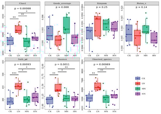 Significance analysis of alpha diversity indices under different nitrogen treatments. Note: asterisks indicate significant differences between treatments: * p < 0.05, ** p < 0.01, *** p < 0.001. Observed Species: the number of unique operational taxonomic units (OTUs) or amplicon sequence variants (ASVs) observed in a sample, serving as a direct measure of species richness. Chao1 Index: an estimator of total species richness. Shannon Index: a composite metric that reflects community diversity by incorporating both species richness and evenness. Simpson Index: a measure of dominance, representing the probability that two randomly selected individuals belong to the same species. Faith’s Phylogenetic Diversity (Faith’s PD): a measure of phylogenetic diversity that quantifies. Pielou’s Evenness: s measure of species evenness that quantifies the uniformity of species abundance distributions in a community. Good’s Coverage: an index of sequencing depth that estimates the probability that a randomly selected sequence in a sample belongs to a species that has already been sequenced; values > 0.97 generally indicate sufficient sequencing depth to reliably characterize the community.
