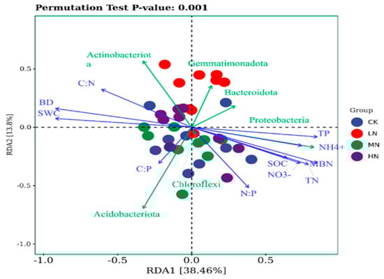The RDA model was statistically significant (p < 0.001). The first two RDA axes together accounted for [52.26]% of the constrained variance (RDA1: [38.46]%, RDA2: [13.8]%). Correlation analysis revealed distinct ecological preferences for key bacterial phyla. Actinobacteria exhibited significant positive correlations with the soil C:N ratio, bulk density (BD), and soil water content (SWC), but a significant negative correlation with the C:P ratio, which emerged as its strongest predictor. In contrast, Proteobacteria showed positive correlations with total phosphorus (TP), ammonium nitrogen (NH4+-N), microbial biomass nitrogen (MBN), total nitrogen (TN), soil organic carbon (SOC), and nitrate nitrogen (NO3−-N), while being negatively correlated with the C:N ratio, BD, and SWC. Among these, NH4+-N was the most influential factor. Furthermore, Acidobacteria demonstrated a strong positive correlation with the C:P ratio, whereas Gemmatimonadota and Bacteroidota were both significantly negatively correlated with it (Figure 9).