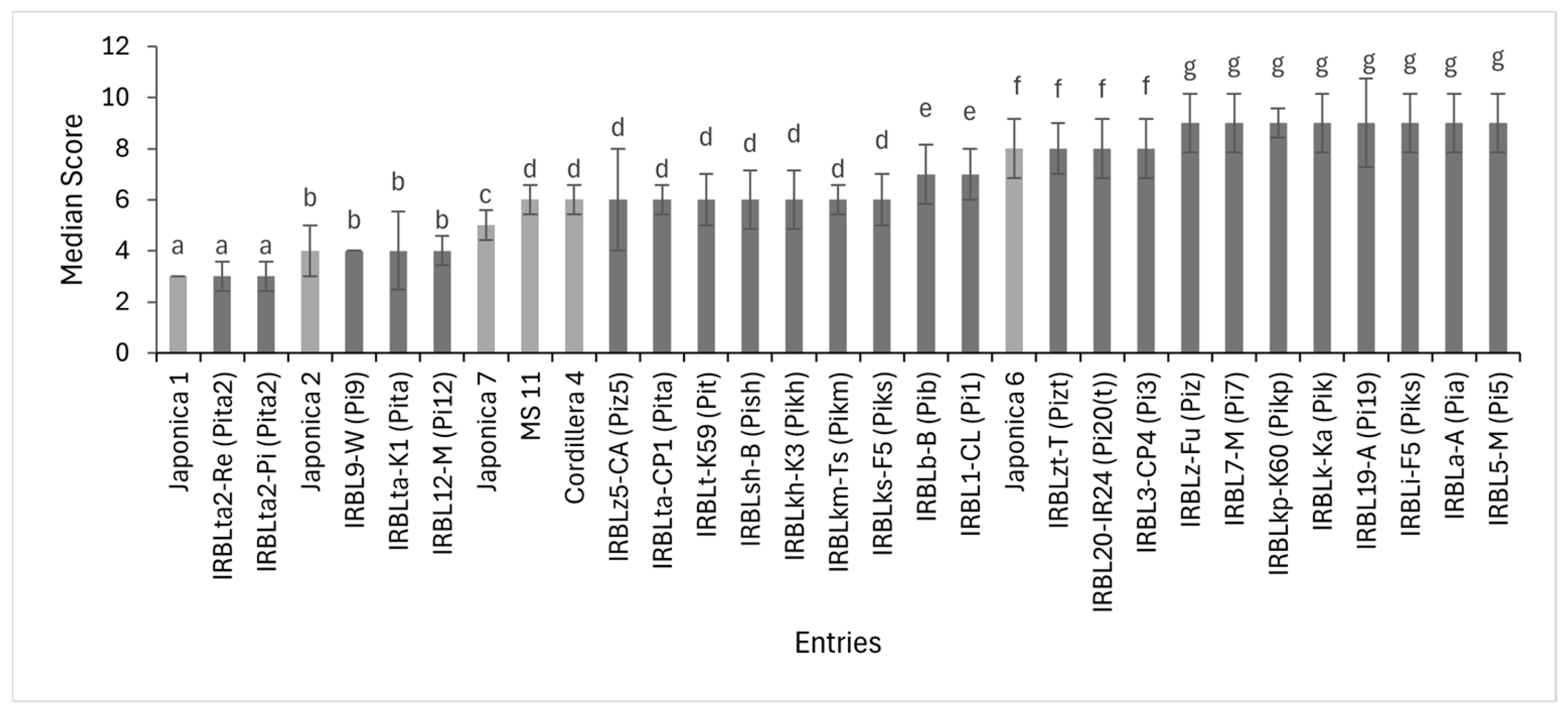3.1. Blast Resistance at Natural Blast Nursery and 27 M. grisea Isolate Inoculation