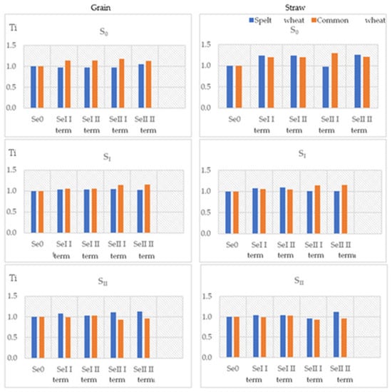 Selenium tolerance index (Ti) for grain and straw of spelt wheat (Triticum spelta L.) and common wheat (Triticum aestivum L.).