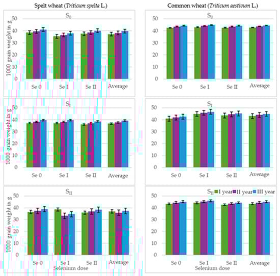 The sulphur fertilisation of spelt wheat resulted in a decrease in its 1000 grain weight. A more noticeable effect (average 4% reduction) was observed in plots fertilised with a higher dose (30 kg S ha−1). The 1000 grain weight of spelt wheat decreased with the addition of selenium to the fertiliser dose, with a more noticeable effect after applying a lower dose. The weight of 1000 grains was then 4.5% lower than in the control plots. Plots fertilised with selenium in the second period had a higher TGW than those fertilised in the first period.