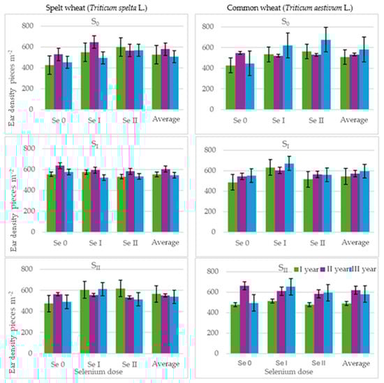 Ear density (pieces per m−2) of spelt wheat (Triticum spelta L.) and common wheat (Triticum aestivum L.) (average for the 1st and 2nd selenium application dates). Spelt wheat: LSD0.05 for A—n.s., B—31.50, C—21.52, A × B—72.36., A × C—n.s., B × C—n.s., A × B × C—n.s. Common wheat: LSD0.05 for A—n.s., B—40.76, C—n.s., A × B—93.63, A × C—n.s., B × C—n.s., A × B × C—n.s.; LSD for A—sulphur dose, B—selenium dose, C—selenium application date; A × B, A × C, B × C, A × B × C—interactions; significant differences at p ≤ 0.05; n.s.—differences not significant.