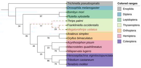 Phylogenetic analysis of FTZ-F1 proteins from M. usitatus and other insects. The Maximum Likelihood phylogenetic tree was constructed based on the amino acid sequences of FTZ-F1 orthologs. Trichinella pseudospiralis was used as the outgroup. Note: Trichinella pseudospiralis (KRX87968.1); Coleoptera: Henosepilachna vigintioctopunctata (URW99151.1), Tenebrio molitor (XP_068892848.1) and Tribolium castaneum (XP_008191374.1); Orthoptera: Gryllus bimaculatus (GLG93513.1), Anabrus simplex (XP_068084123.1); Hemiptera: Acyrthosiphon pisum (XP_029344120.1), Nilaparvata lugens (XP_039286690.1) and Macrosteles quadrilineatus (XP_054273940.1); Lepidoptera: Plutella xylostella (KAG7313439.1), Bombyx mori (NP_001037528.2); Diptera: Drosophila melanogaster (NP_524143.2); Thysanoptera: Frankliniella occidentalis (XP_026277177.1), Thrips palmi (XP_034255744.1), Megalurothrips usitatus.