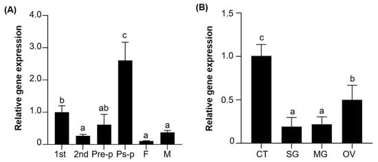 Spatiotemporal expression profile of MuFTZ-F1 in M. usitatus. (A) Relative transcript levels of MuFTZ-F1 across different developmental stages: 1st instar (1st), 2nd instar (2nd), Pre-pupa (Pre-p), Pupa (Ps-p), Female adult (F), Male adult (M). (B) Tissue-specific expression of MuFTZ-F1 in adult females, including cuticle (CT), salivary gland (SG), midgut (MG), ovary (OV). Data are presented as mean ± SEM (n = 3). Different lowercase letters above bars indicate statistically significant differences among groups as determined by one-way ANOVA followed by Tukey’s test (p < 0.05).