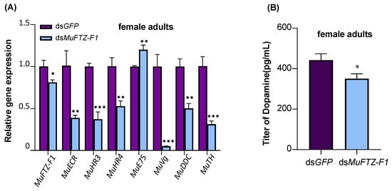 Consequently, dsMuFTZ-F1 treatment led to a significant reduction in the dopamine titer of female adults compared to the control (t(4) = 3.950, p = 0.017) (Figure 4B).