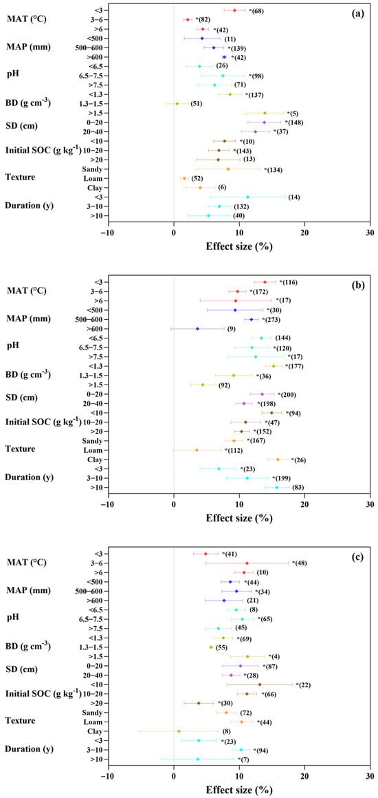 Responses of the SOC to explanatory variables under different tillage management practices: (a) no tillage (NT), (b) reduced tillage (RT), and (c) deep tillage (DT). The numbers in the graph represent the number of comparisons (control + treatment). The points and error bars represent the mean and 95% confidence intervals. Abbreviations: SOC, soil organic carbon; MAT, mean annual temperature (°C); MAP, mean annual precipitation (mm); BD, bulk density (g cm−3); SD, soil depth (cm); initial SOC, initial soil organic carbon (g kg−1). * represents significant differences at p < 0.05.