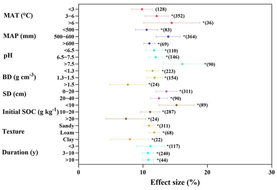 The SOC’s responses to its explanatory factors under SR are shown in Figure 3. Except for the MAT (<3 °C) group, a significantly positive relationship was identified between all the other explanatory variables and the SOC response to SR management. The largest increase in the SOC reached 17.44% in the soil pH (>7.5) group, followed by 15.22% in the initial SOC (<10 g kg−1) group, which were the greatest value increases across all the conservation practices in this study. Climatic factors, i.e., MAT and MAP, indicated positive increased effects on the SOC response to SR with the increase in the two factors. For instance, the increase in SOC increased from 10.57% to 13.92% in the <500 and 500–600 mm MAP groups, respectively. Meanwhile, the increase in SOC increased with the increase in the soil pH values, where the effect sizes were 11.73%, 11.98%, and 17.44% in the <6.5, 6.5–7.5, and >7.5 groups, respectively. After SR, the larger increase in SOC reached 11.82% in the BD (1.3–1.5 g cm−3) group, 13.64% and 12.49% in the soil depth (0–20 cm and 20–40 cm) groups, and 11.76% in the soil texture (loam) group. Regarding the duration, the largest increase in the SOC showed no increased trend with the increase in the duration, while it reached 11.17% in the <3 y group, followed by 10.83% and 10.75% in the >10 y and 3–10 y groups, respectively.
