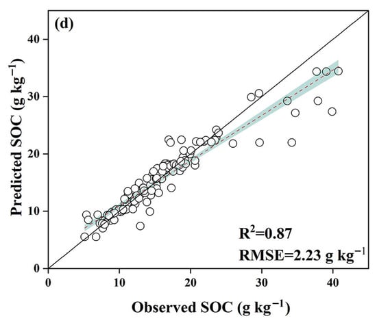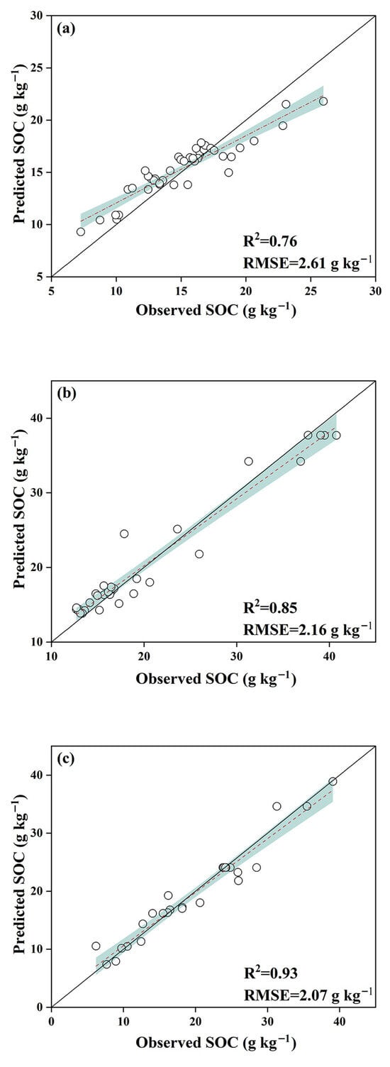 Scatter plots of the predicted SOC versus observed SOC using the RF model under different management practices: (a) no tillage (NT), (b) reduced tillage (RT), (c) deep tillage (DT), and (d) straw return (SR). The dashed lines represent the fitted curves, and the shaded area represents the 95% confidence intervals. The solid line represents the 1:1 line.