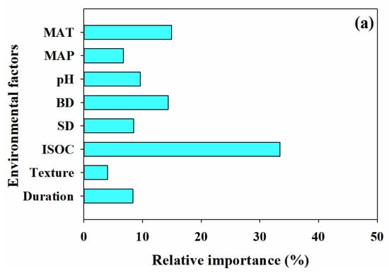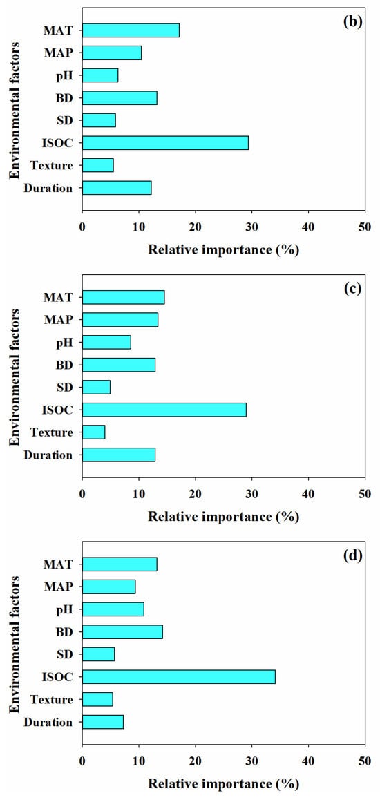 In addition, the data used in the RF models needed to be compiled into consistent forms, namely SOC, MAT, MAP, soil pH, bulk density, soil depth, initial SOC, soil texture, and duration, for the above four conservation practices. Notably, soil texture was regarded as a category value, while the other variables were continuous data values.