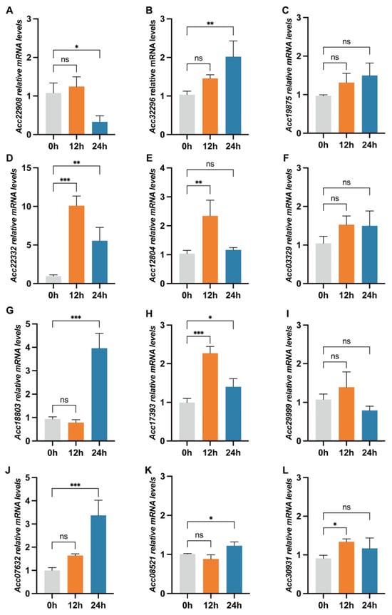 Time-course expression patterns of 12 candidate genes in the resistant cultivar ‘Jinkui’ after SA treatment ((A)–(L)). Time-course expression pattern 12 candidate genes in the resistant cultivar ‘Jinkui’ after SA treatment. Gene expression was analyzed by RT-qPCR at indicated time points (hpi). The data represent mean ± SE (n = 3). Asterisks indicate that the value is significantly different from that of the 0 h, where p < 0.05 (*), p < 0.01 (**), p < 0.001 (***), and p > 0.05 (ns, not significant).