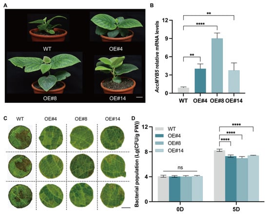 Expression and functional analysis of AcMYB15. (A) Observations of AcMYB5-OE and wild type of ‘Hongyang’. Scale bar = 3 cm. (B) Expression profiles of AcMYB5 in AcMYB5-OE. (C) Observation of adaxial leaves lesions in the WT and AcMYB15-OE 5 d after Psa infection. Scale bar = 0.5 cm. (D) Bacterial counting of the growth of Psa from WT and AcMYB5-OE leaves. Data represent means ± SE (n = 3). Asterisks indicate that the value is significantly different from that of the WT, where p < 0.01 (**), p < 0.0001 (****), and p > 0.05 (ns, not significant).