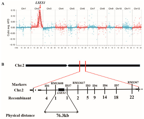 Genetic mapping of LSES1. (A) Preliminary localization of LSES1 based on BSA-seq analysis. This image displays the visualization results of the differences between the recessive pool and the dominant pool. The Y-axis represents the third power of the average allele frequency difference (avg. AFD) of a block, the X-axis represents the physical position of 12 rice chromosomes (unit: Mb), the light colored scatter points represent the blocks (10 kb in size), and the dark curves are the lines connecting the fitted values of the block statistic (average allele frequency). The scatter points and lines of adjacent chromosomes are represented by light/dark blue and light/dark red colors spaced apart from each other. The candidate interval for allele frequency difference (AFD) has been preliminarily determined to be between Chr.2 24–28 Mb, with the peak located near 26 Mb. (B) Fine mapping of LSES1. Numbers under the markers indicate the number of recombinants.