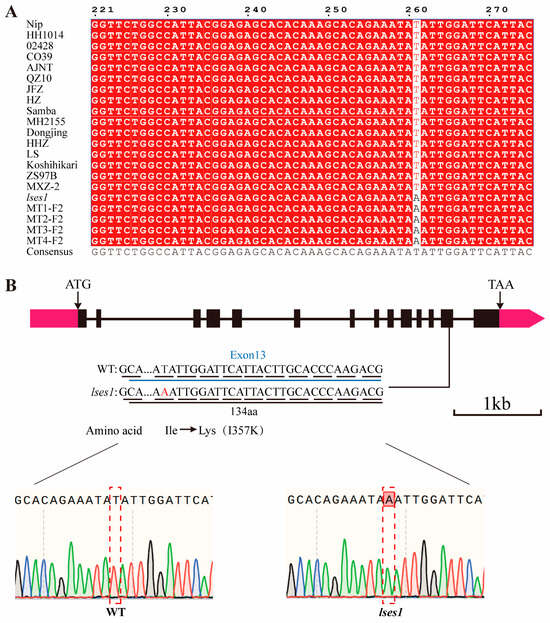 Sequencing analysis of mutation sites in the LSES1 candidate gene LOC_Os02g40860. (A) Sequence alignment analysis of the 1070th base mutation site in the coding region of LOC_Os02g40860 among different germplasms. (B) Gene structure of LOC-Os02g40860 and sequencing analysis of the mutation site of the lses1 mutant.
