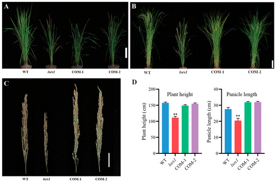 Phenotypic validation of genetic complementation transgenic lines for LOC_Os02g40860. (A) Plant phenotypes of the wild type (WT, HH1014), lses1, and the genetic complementation transgenic lines in the lses1 background, COM-1, and COM-2, in the tillering stage. Bar = 20 cm. (B) Plant phenotypes of WT, lses1, COM-1, and COM-2 in the heading stage. Bar = 20 cm. (C) Panicle morphology of WT, lses1, COM-1, and COM-2. Bar = 10 cm. (D) Values of plant height and panicle length of WT, lses1, COM-1, and COM-2. Values are means ± SD (n = 5). p values were determined using Student’s t-test compared with WT (HH1014). **, p < 0.01.
