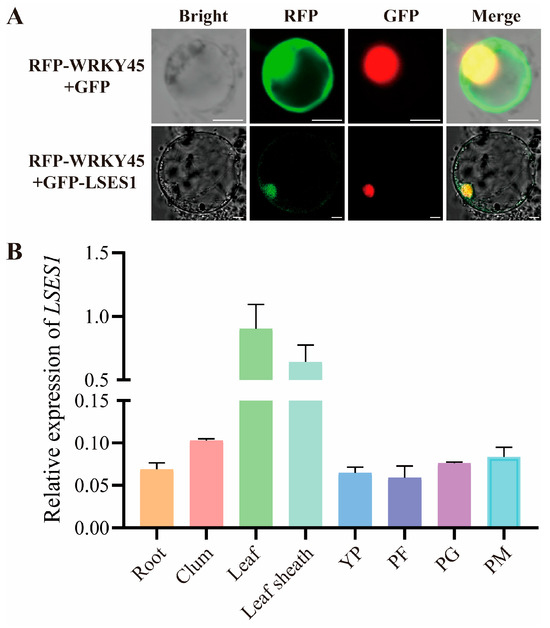The subcellular localization of LSES1 was detected using the transient expression system of rice protoplasts. In both the control group (pRTV-nRFP-WRKY45 + pRTV-nGFP) and experimental group (pRTV-nRFP-WRKY45 + pRTV-nGFP-LSES1), red and green fluorescence were detected (excluding the bright field), indicating the successful plasmid transformation and expression in the protoplasts (Figure 7A). In the control group (pRTV-nRFP-WRKY45 + pRTV-nGFP), the green fluorescence was distributed throughout the cell, while the nuclear-localized RFP-WRKY45 red fluorescence was confined to the nucleus (Figure 7A). In the experimental group (pRTV-nRFP-WRKY45 + pRTV-nGFP-LSES1), both the red and green fluorescence were exclusively localized in the nucleus, demonstrating the co-localization of GFP-LSES1 with RFP-WRKY45 (Figure 7A). This revealed that the LSES1 protein is localized in the nucleus.