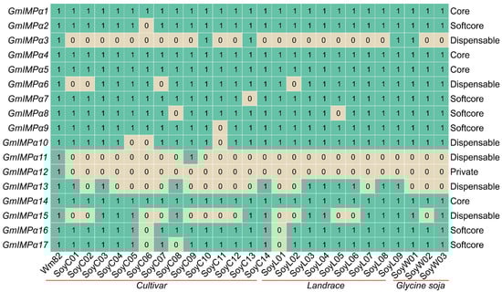 Number of IMPα homologs in wild and cultivated soybean pan-genomes. Rows represent GmIMPα family genes arranged by chromosomal physical position; columns correspond to different individual genomes (see Table S1 for variety numbers). Gene classification follows pan-genome definitions: Core genes are shared by all individuals (100%); soft core genes are part of the non-essential genome subset, present in 95–98% of individuals; dispensable genes are shared by 5–94% of individuals; private genes are those found only in a single individual. The numbers within the boxes indicate gene presence, where ‘1’ denotes the gene is present and ‘0’ denotes it is absent.