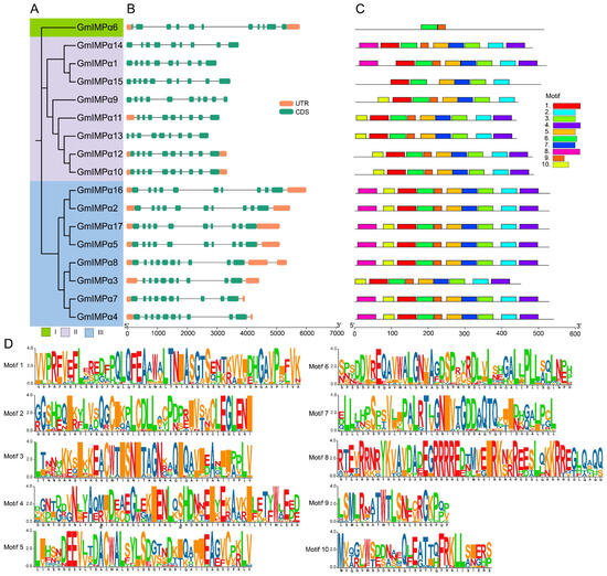 Phylogenetic analysis classified the soybean GmIMPα gene family into three subfamilies (Figure 2A), each distinguished by a different background color in the phylogenetic tree. Gene structure analysis revealed that members of the GmIMPα gene family contain 9 to 11 exons and 8 to 10 introns, with significant variation in gene length among the different subfamilies. Specifically, the average gene length of Clade II members is considerably shorter than that of Clade I and Clade III. Notably, some genes located on adjacent branches of the phylogenetic tree often exhibit similar gene structure characteristics. For example, in Clade II, the gene lengths of GmIMPα10 and GmIMPα12 are comparable (3369 bp and 3357 bp, respectively), and both genes possess 10 exons. Further sequence analysis of the GmIMPα family proteins identified ten conserved motifs (Figure 2C,D), with amino acid lengths as follows: Motifs 1, 4, and 8 consist of 50 amino acids; Motif 6 consists of 44 amino acids; Motifs 2, 3, 5, and 7 each comprise 41 amino acids; Motif 10 consists of 29 amino acids; and Motif 9 is the shortest, containing only 21 amino acids. Among these conserved motifs, Motif 6 is highly conserved and consistently positioned across all GmIMPα protein sequences, whereas Motifs 1, 2, 3, 5, and 7 are conserved in 16 members except GmIMPα6. It is particularly noteworthy that, although Clade I contains only GmIMPα6 and its gene structure is similar to those of other subfamily members, its motif composition displays significant differences, suggesting possible functional divergence of this gene. In summary, the combined analysis of gene structure and conserved motifs provides strong evidence supporting the phylogenetic relationships within the GmIMPα gene family.