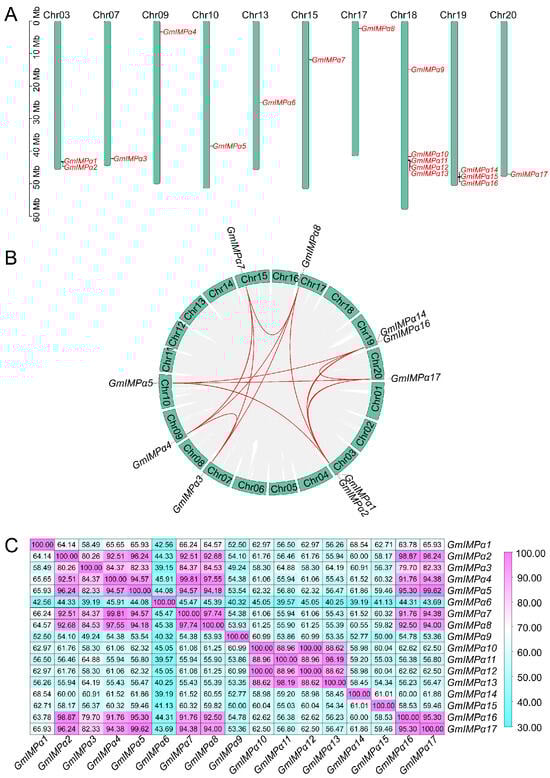 Genomic analysis of soybean GmIMPα genes. (A) Chromosomal distribution of GmIMPα family members. Chromosome numbers are indicated at the top of each chromosome. A scale bar on the left shows the actual chromosome length (in megabase pairs, Mb). This panel highlights the specific genomic locations of GmIMPα genes, providing insight into their chromosomal distribution within the soybean genome. (B) Syntenic relationships of GmIMPα genes within the soybean genome. Chromosome numbers are shown in green boxes. Red lines indicate syntenic relationships among GmIMPα gene pairs, while gray lines represent collinear blocks across the soybean genome. (C) Heatmap of protein sequence similarity among GmIMPα members. Darker pink shades indicate higher levels of protein sequence similarity.